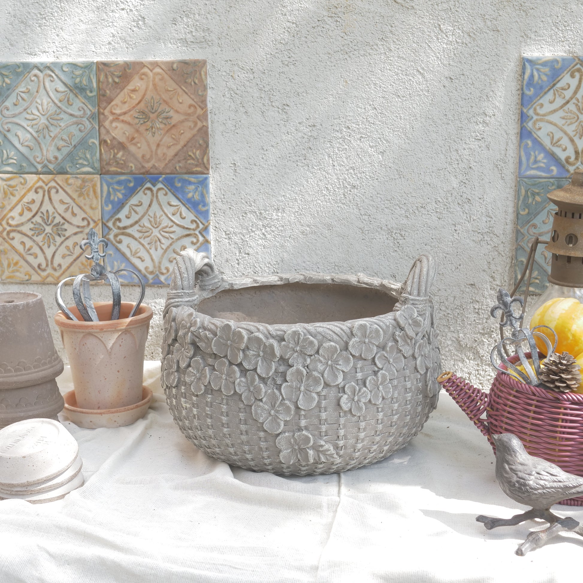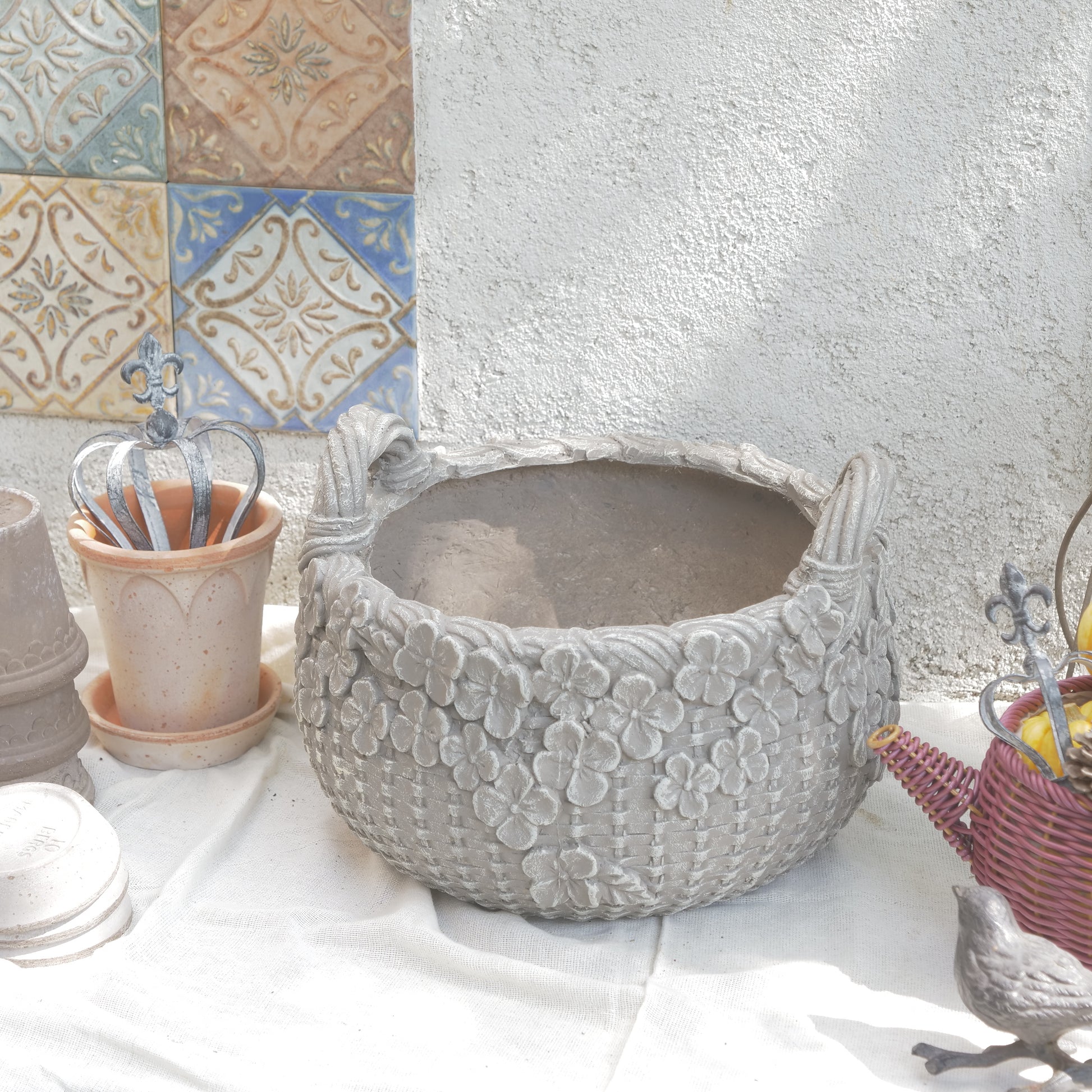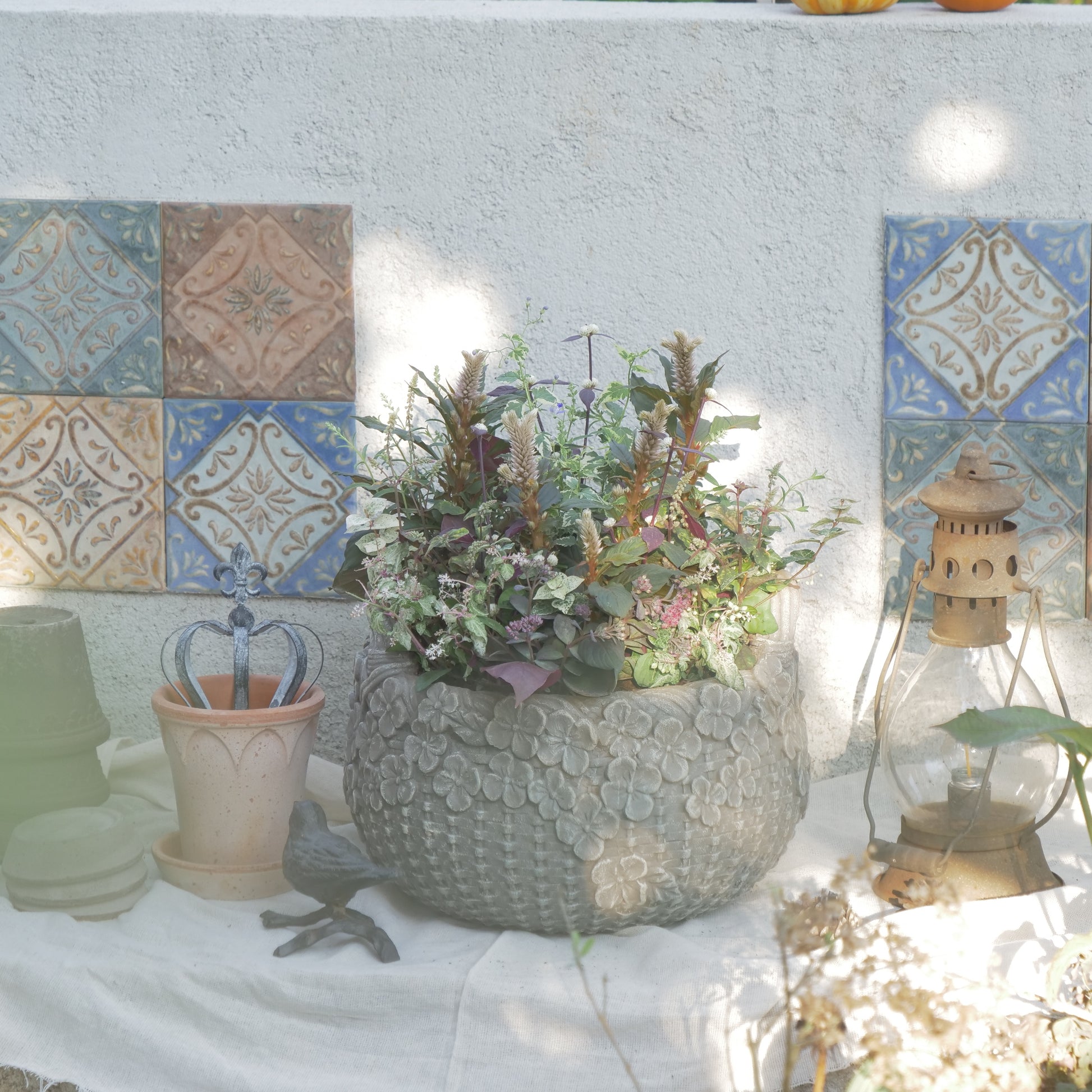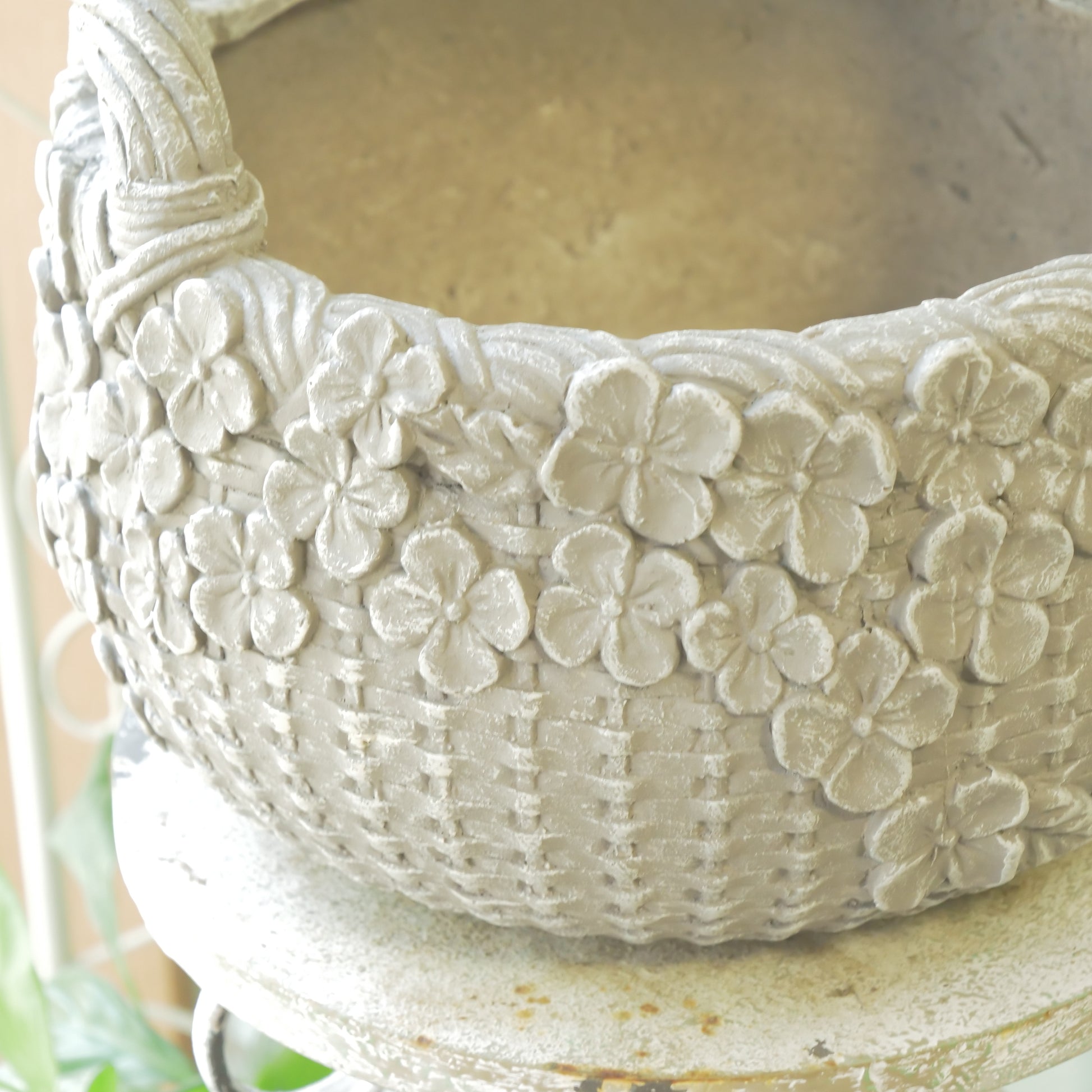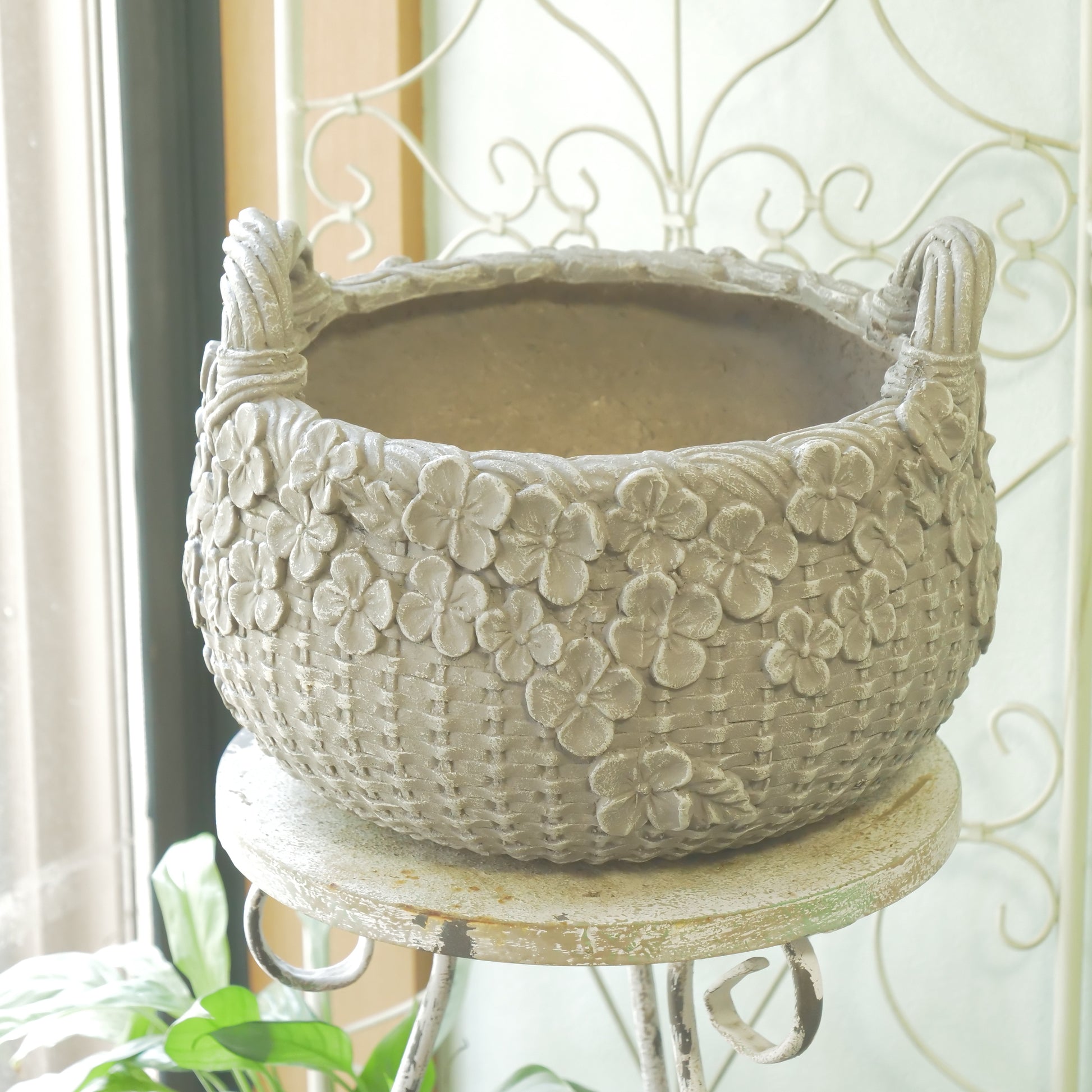 こちらは、カルナックさんの大人気の新商品です。花の模様が可愛いバスケット型鉢です。かなりゆったりしていますので、たくさんのお花を植える事ができます。グラスファイバー鉢なので丈夫で軽いです。カラーはブラック系になります。秋冬のお花にピッタリの鉢で、見た目もとてもかわいいのでオススメです。