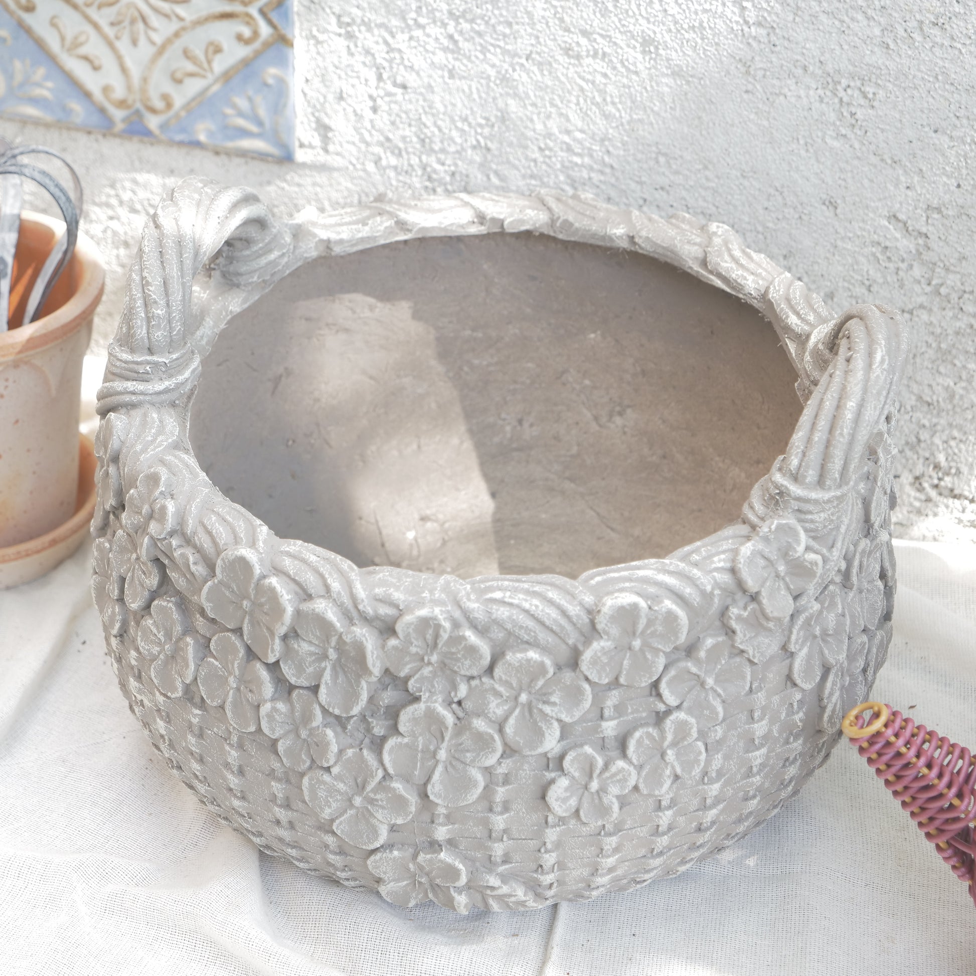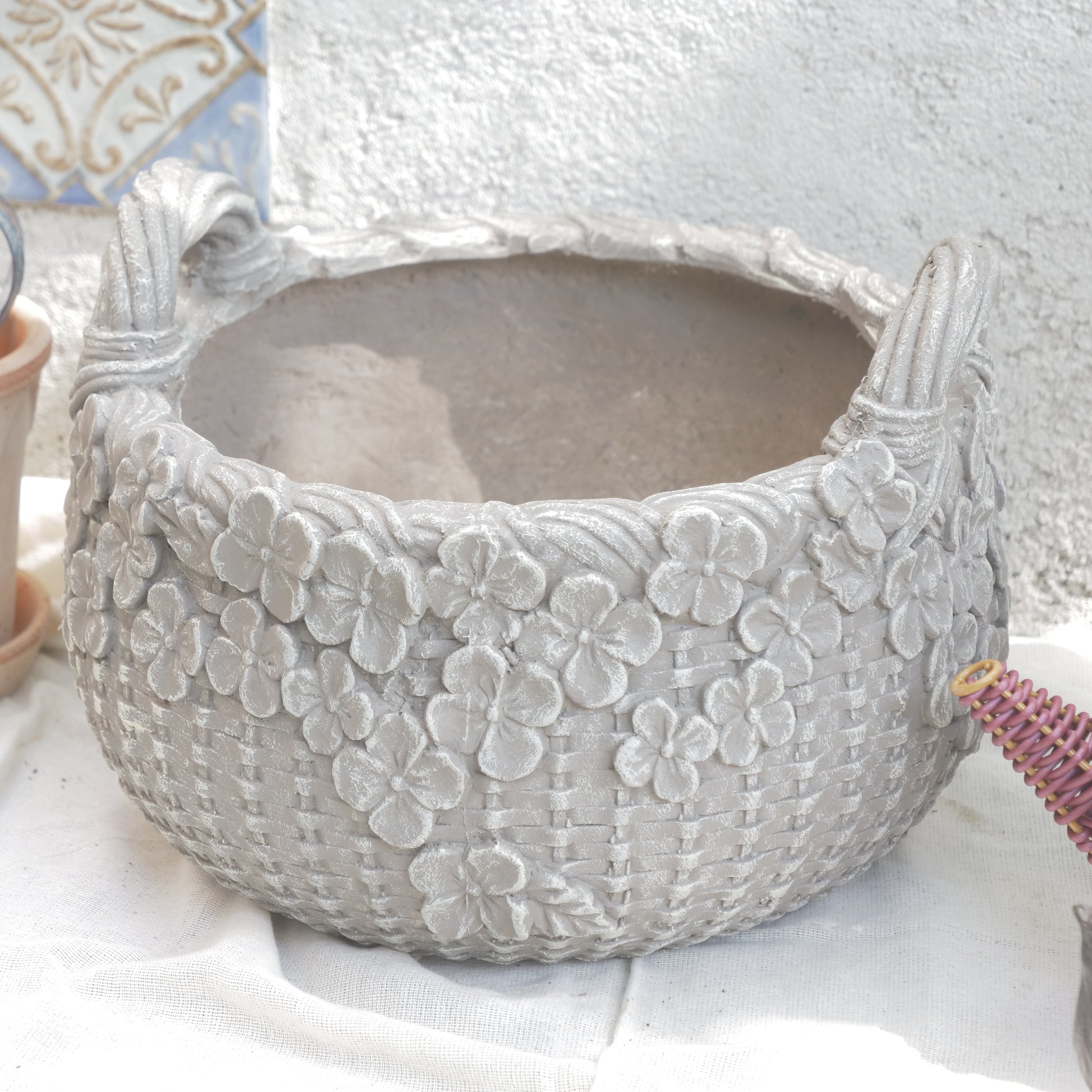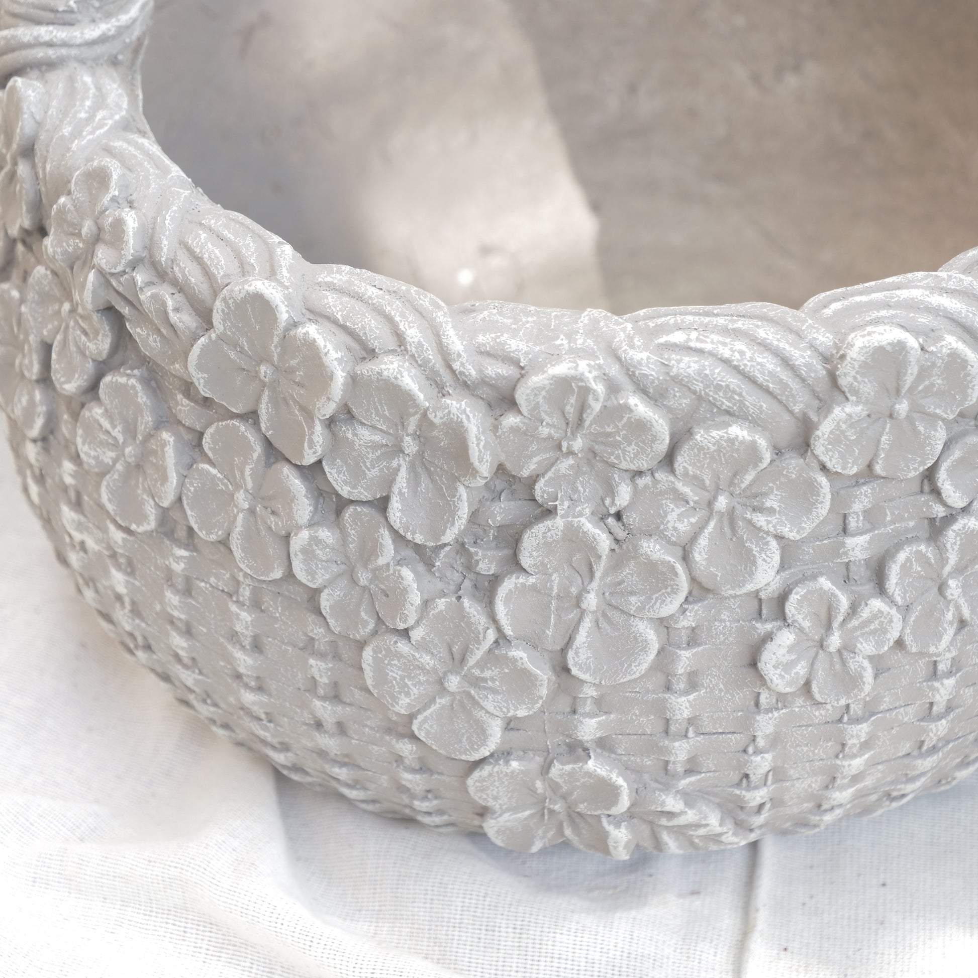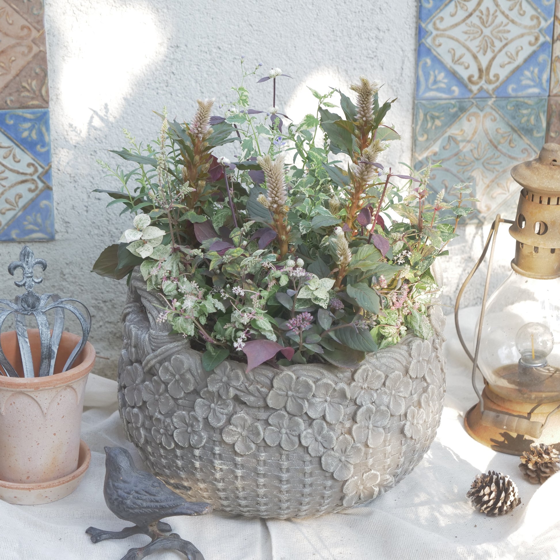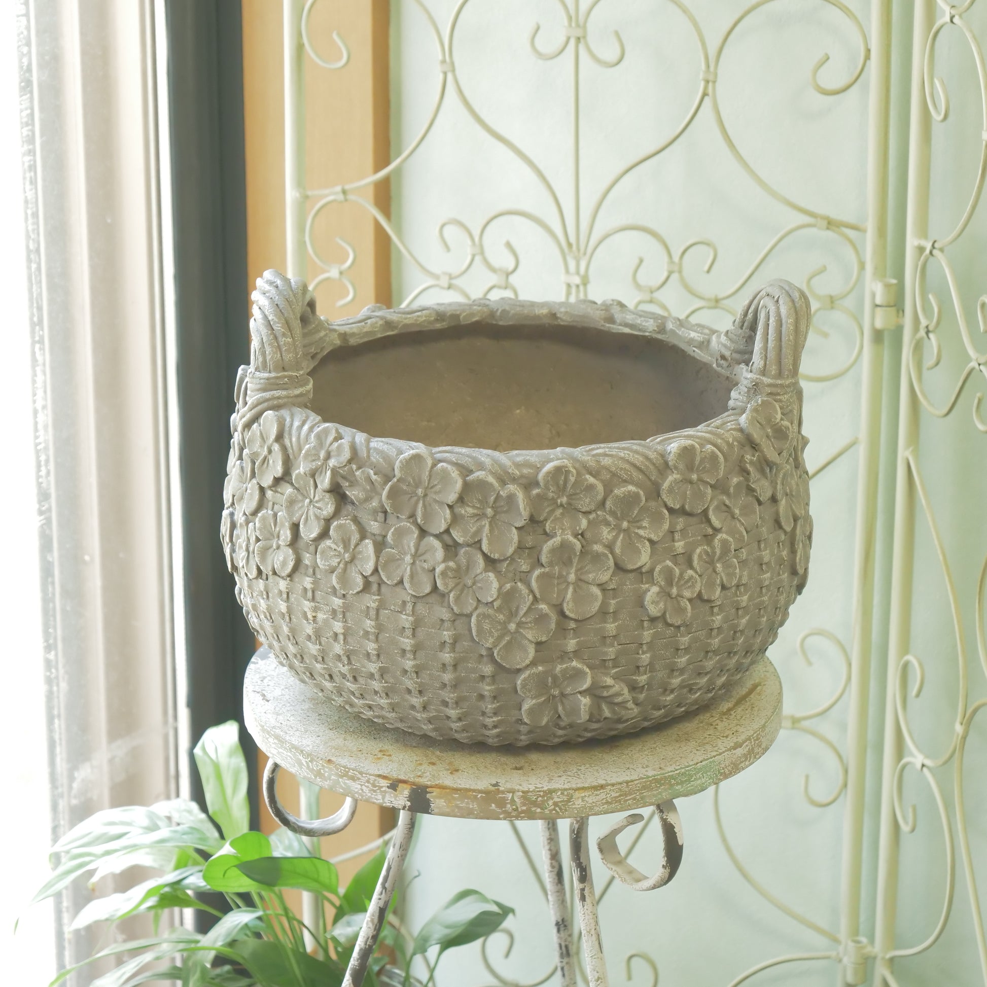 こちらは、カルナックさんの大人気の新商品です。花の模様が可愛いバスケット型鉢です。かなりゆったりしていますので、たくさんのお花を植える事ができます。グラスファイバー鉢なので丈夫で軽いです。カラーはブラック系になります。秋冬のお花にピッタリの鉢で、見た目もとてもかわいいのでオススメです。