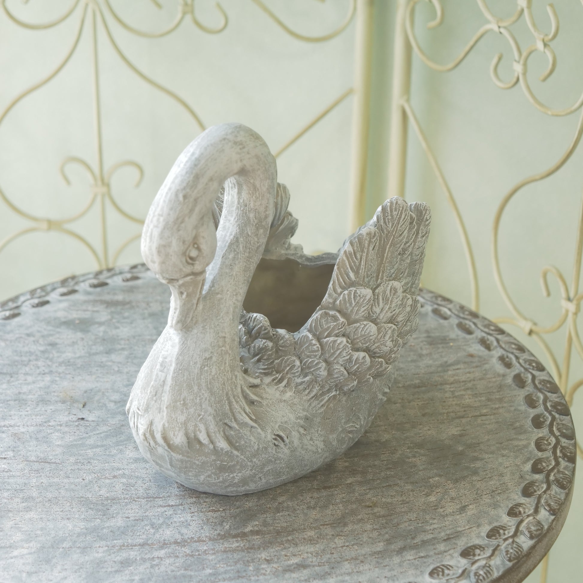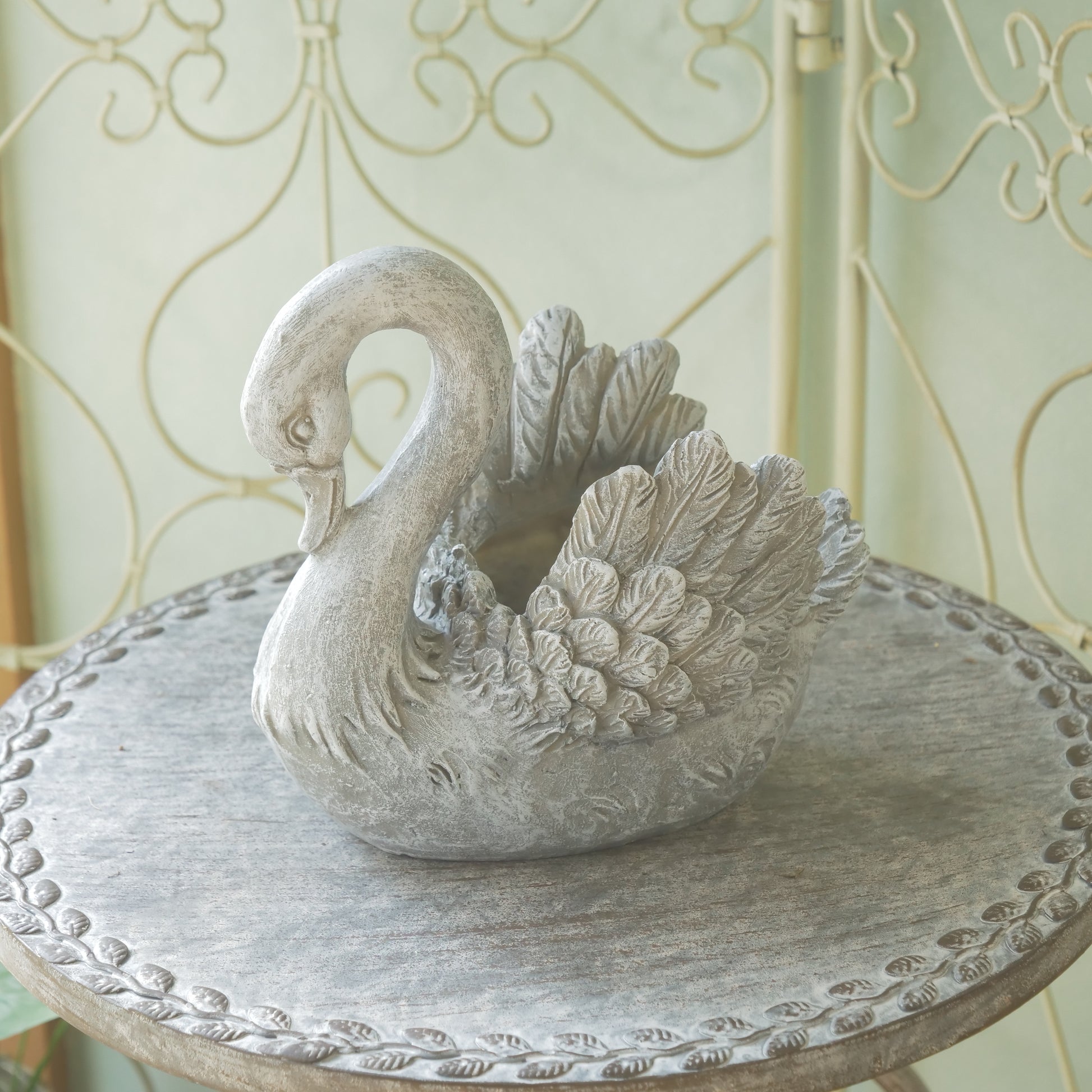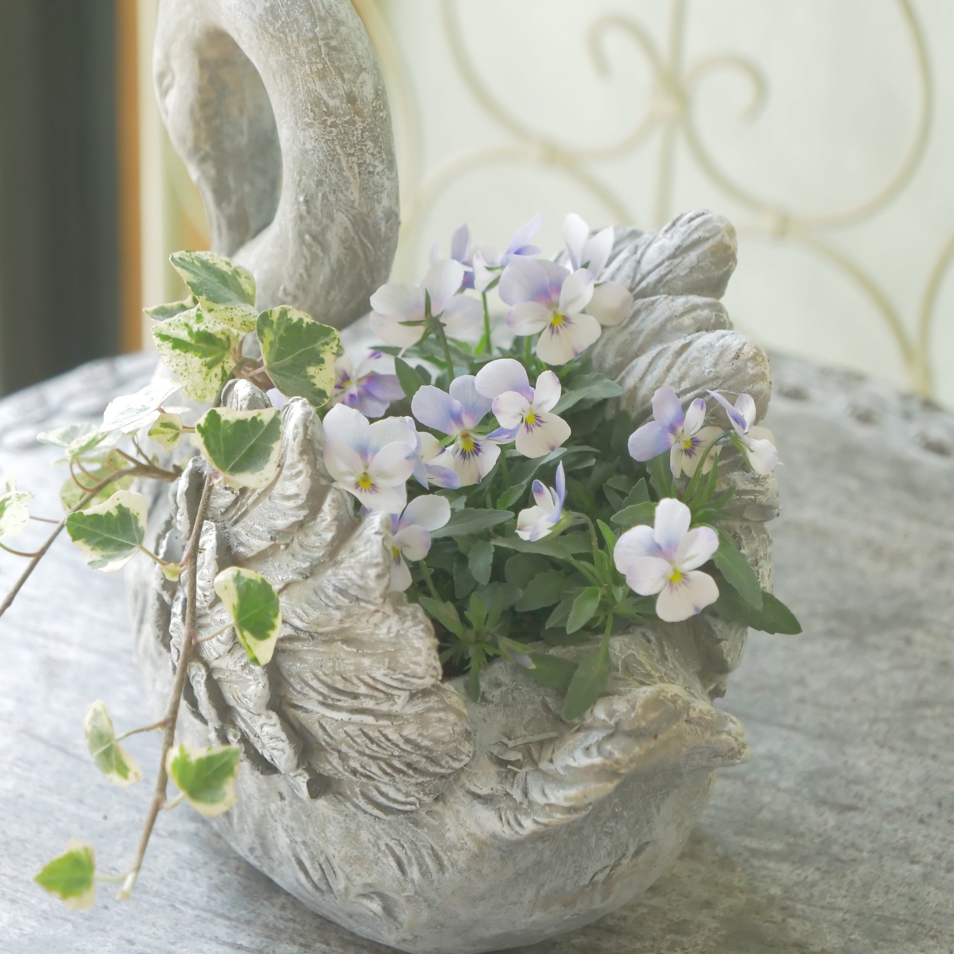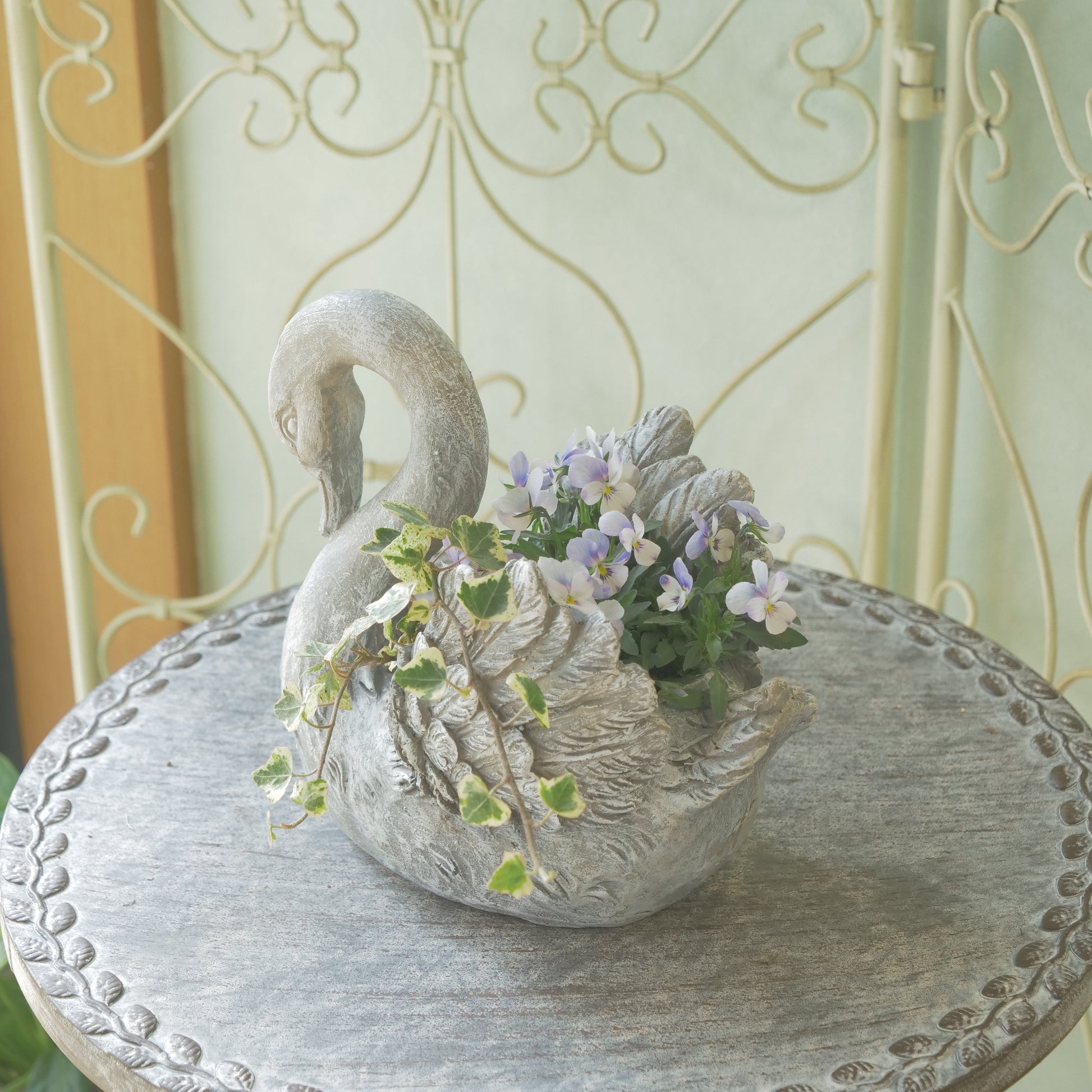 スワンの形をした、珍しく、可愛らしい見た目の鉢になります。小さめのデザインです。パンジーやビオラなどのお花を1ポット植えるのに花を寄せ植えに、丁度いいサイズです。見た目がシックで素敵です。樹脂製ですので、割れにくい素材です。