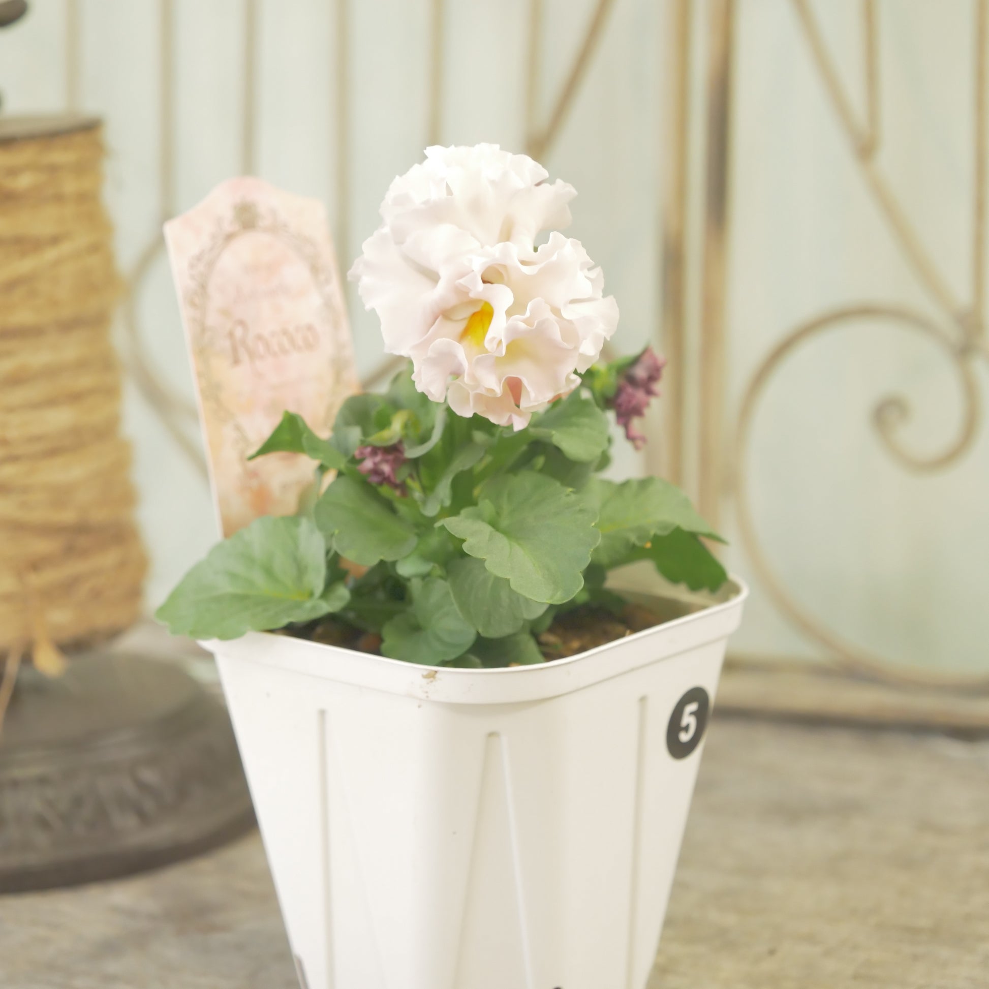 こちらは、佐藤園芸さん生産の、大人気で入手困難なパンジー【ローブ・ドゥ・アントワネット ロココ】です。他には無い、豪華なフリルの花と、シックなアンティークカラーが特徴のパンジーです。さすが佐藤園芸さん!必ず次の蕾が付いた株になります。