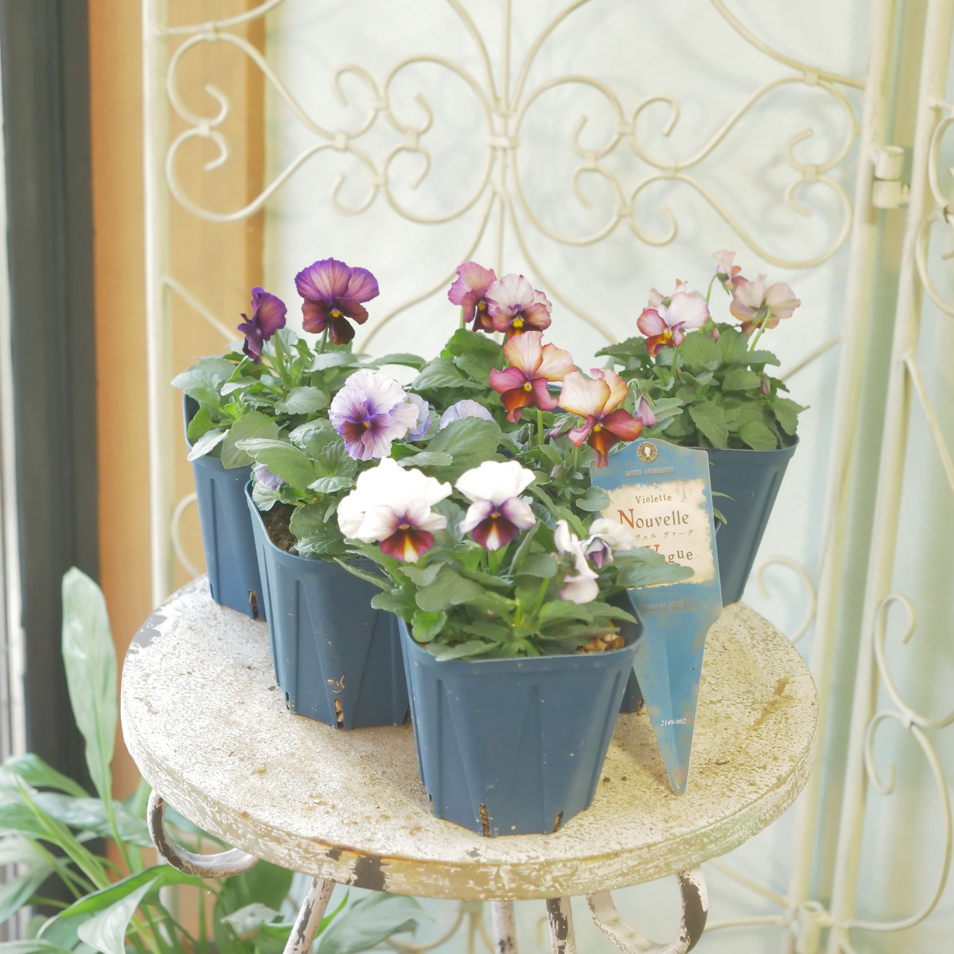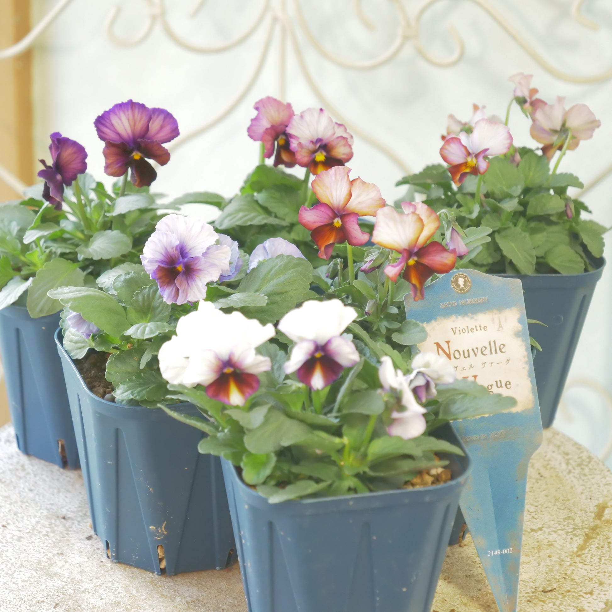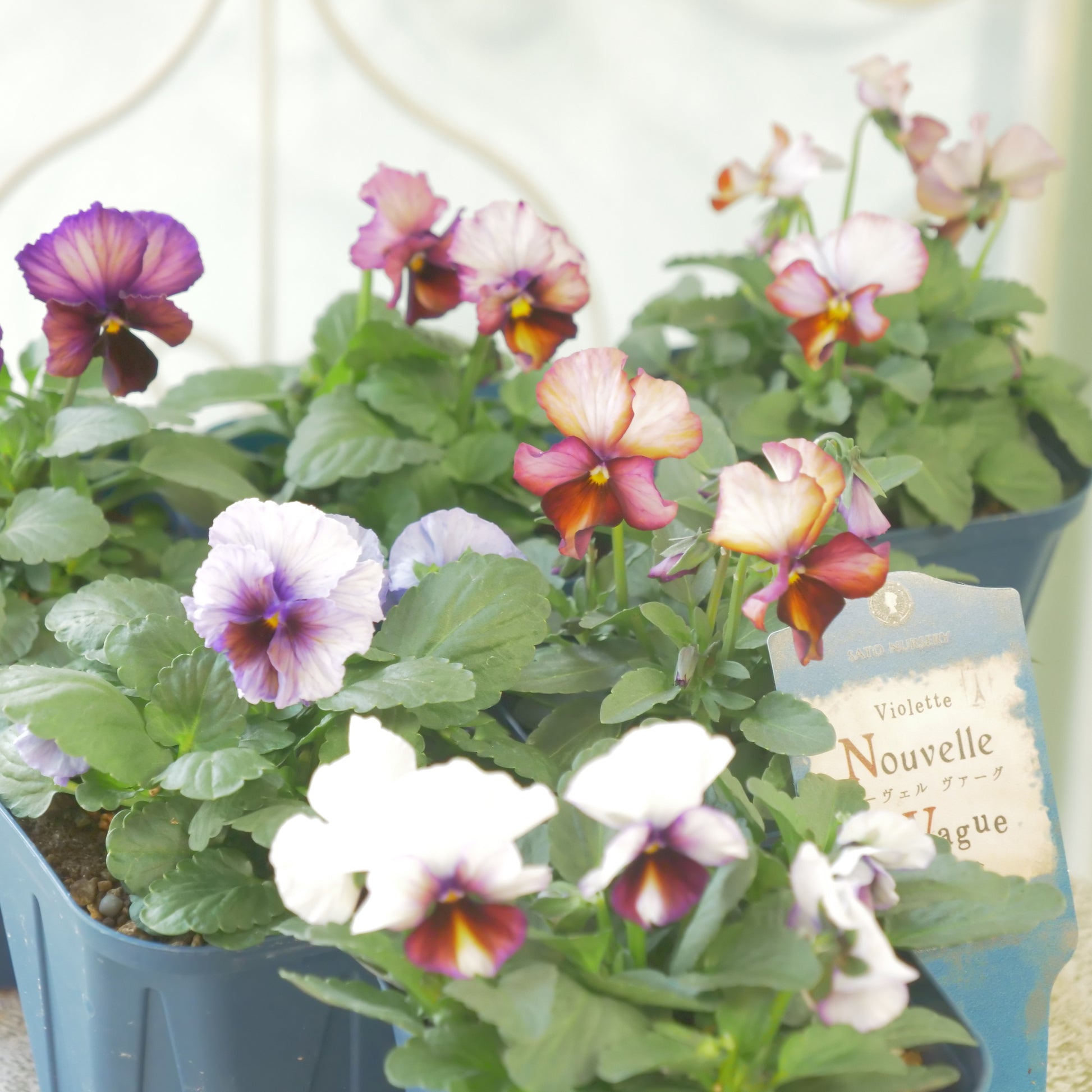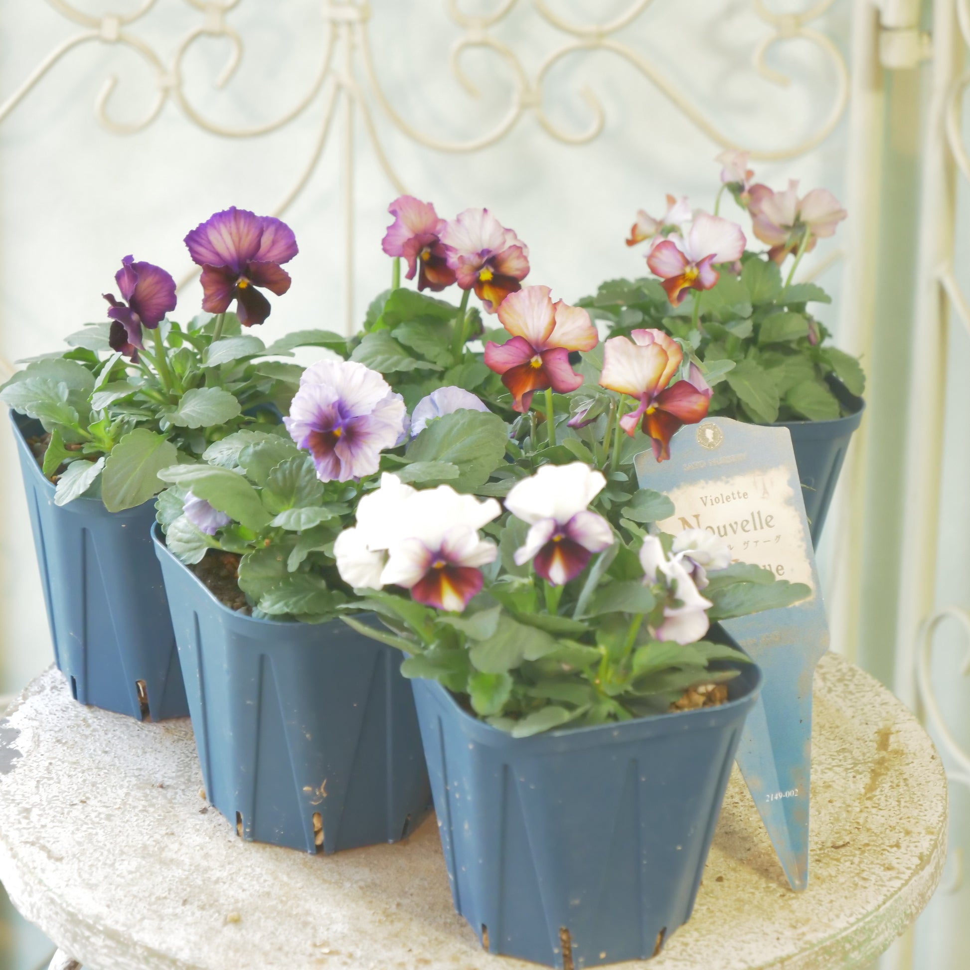 こちらは、佐藤園芸さんオリジナルビオラ【ヌーヴェルヴァーグ】です。シックな水彩画のような花色です。たくさんの花が咲くと、とても綺麗です。
