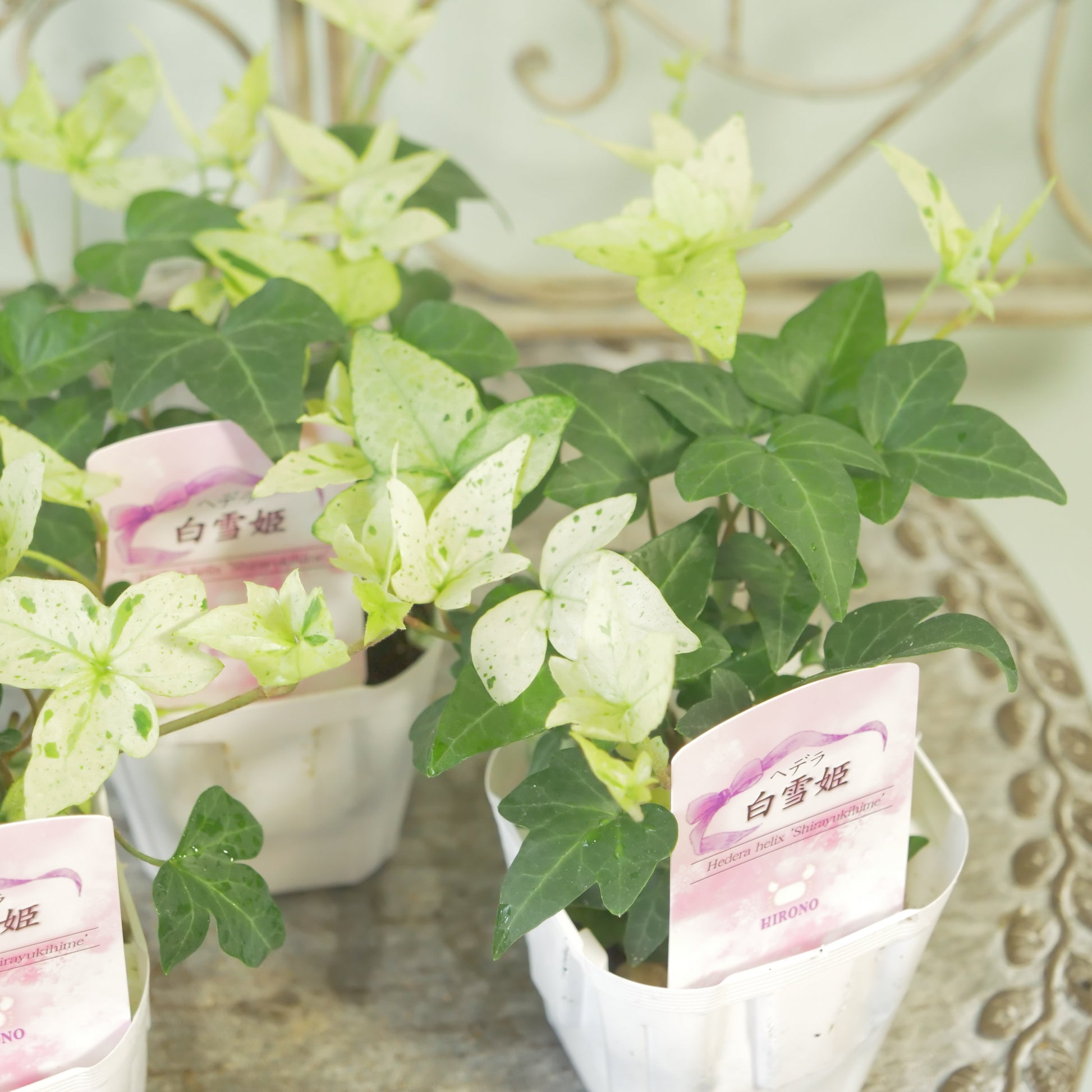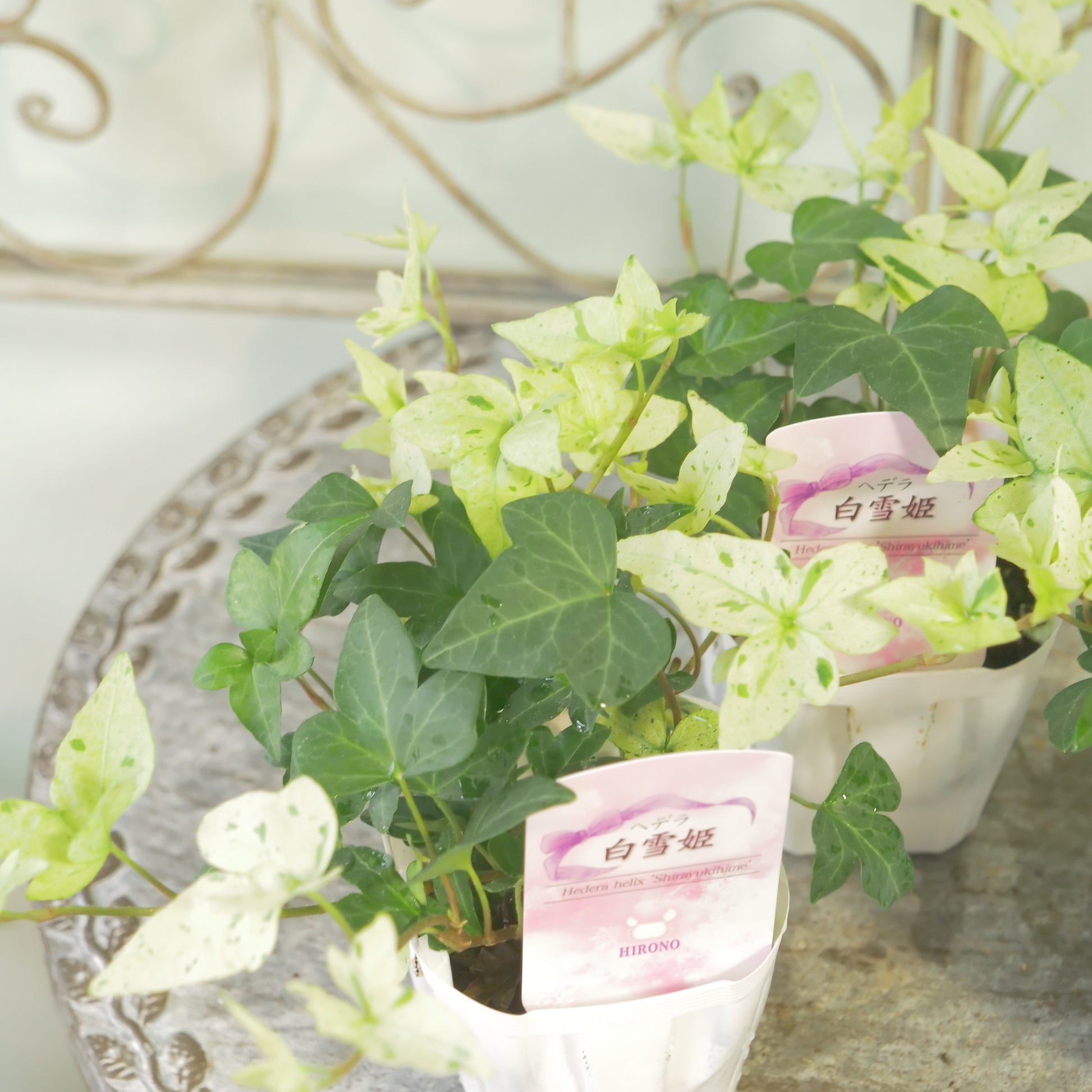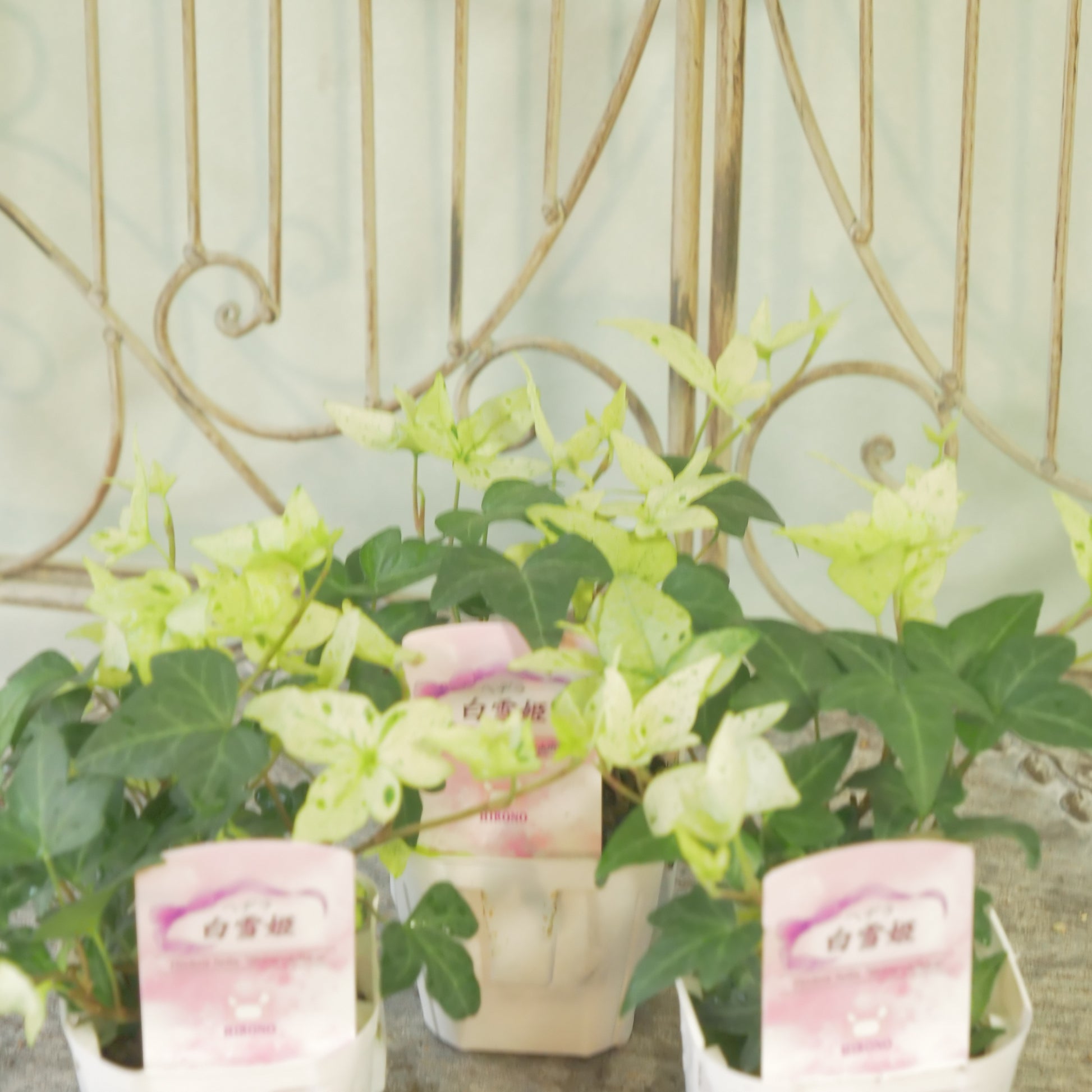 こちらは、広野園芸さんオリジナルのヘデラ【白雪姫】です。冬の寄せ植えに欠かせません。強健で、冬の寒さにも強く長く楽しむ事ができます。数本植えになっていますので、1本ずつ分解して、寄せ植えに使う事ができます。