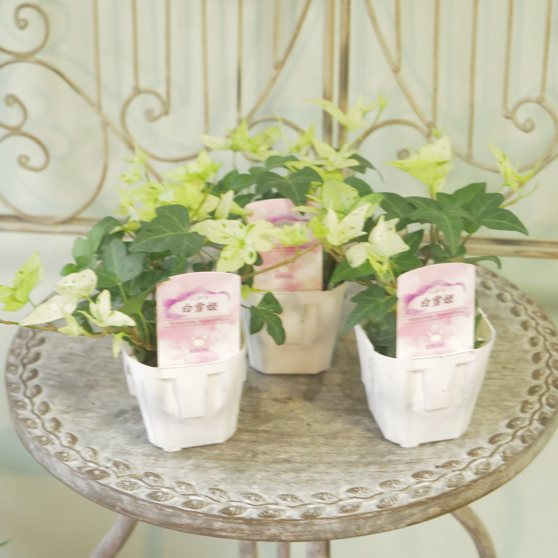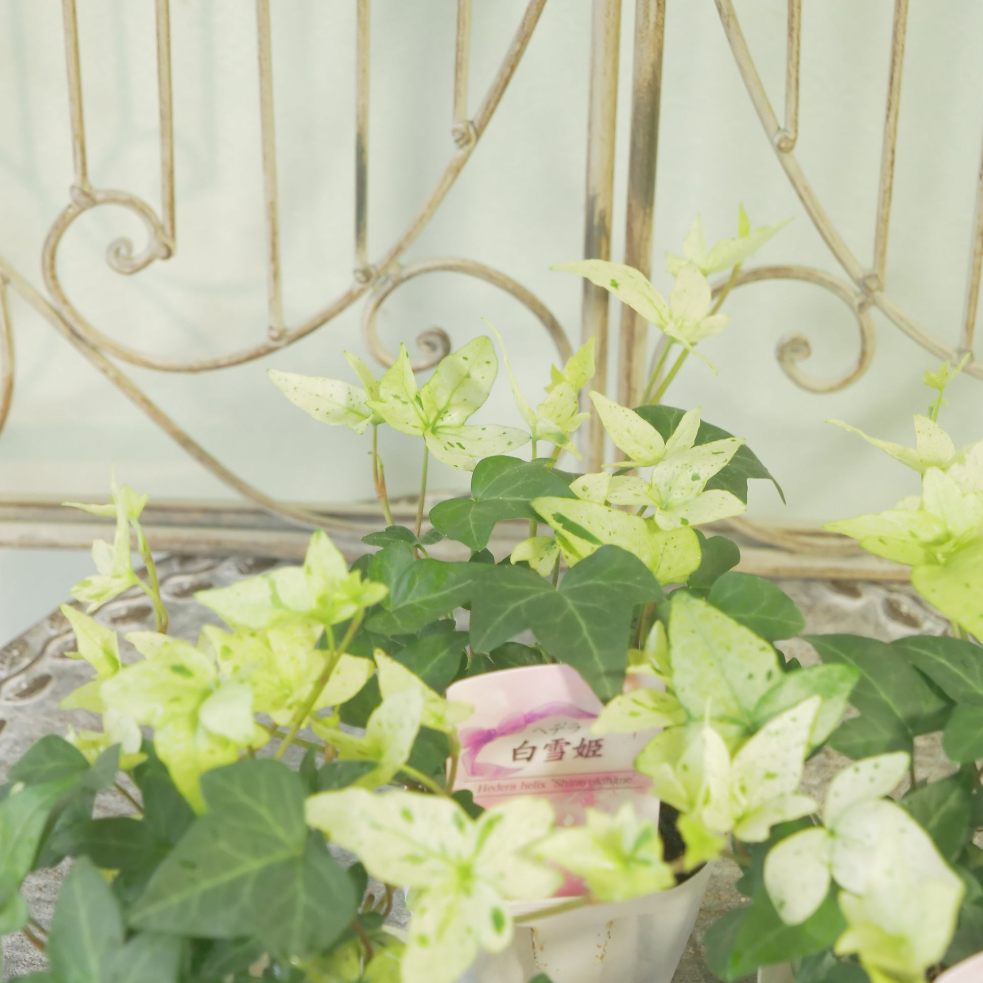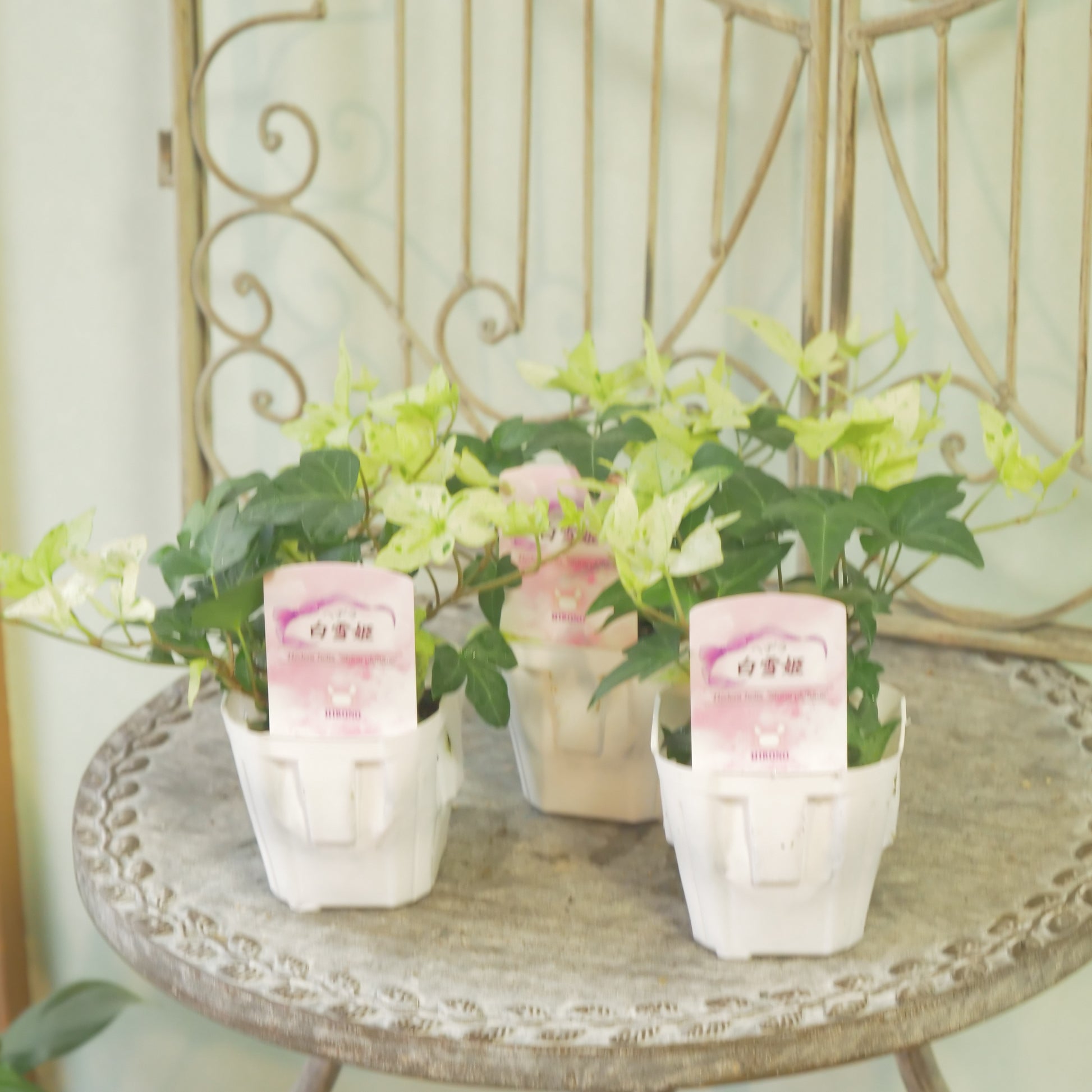 こちらは、広野園芸さんオリジナルのヘデラ【白雪姫】です。冬の寄せ植えに欠かせません。強健で、冬の寒さにも強く長く楽しむ事ができます。数本植えになっていますので、1本ずつ分解して、寄せ植えに使う事ができます。