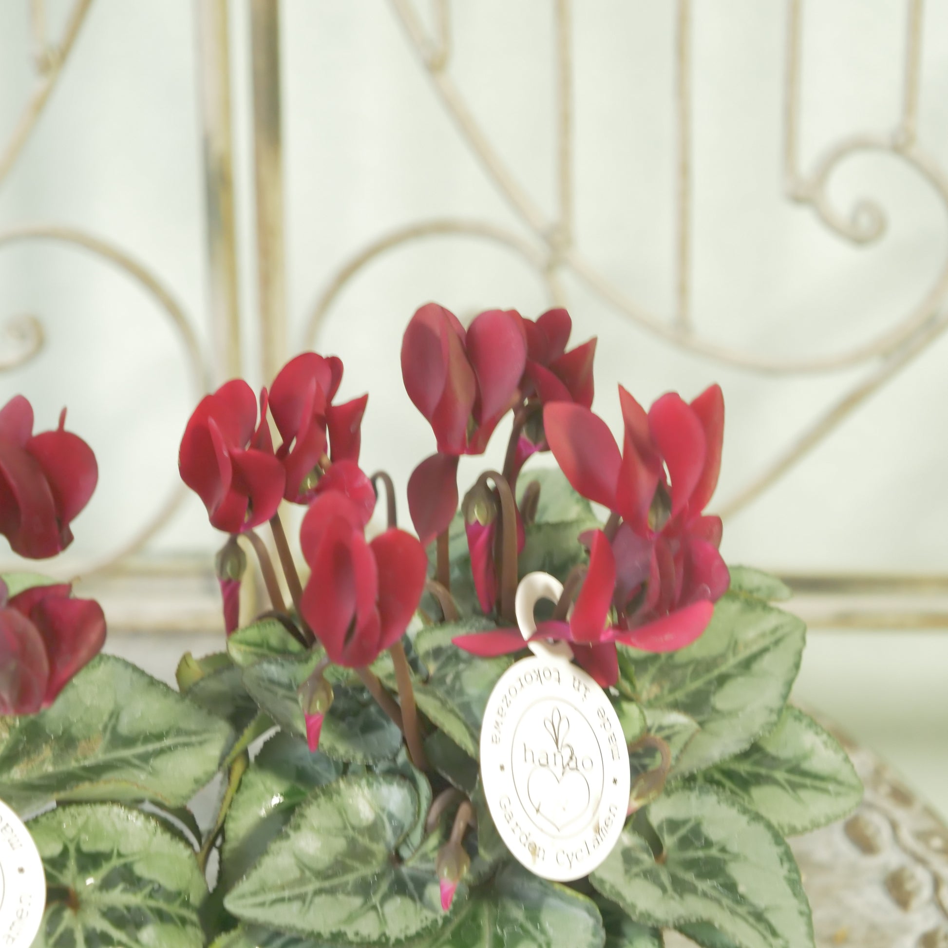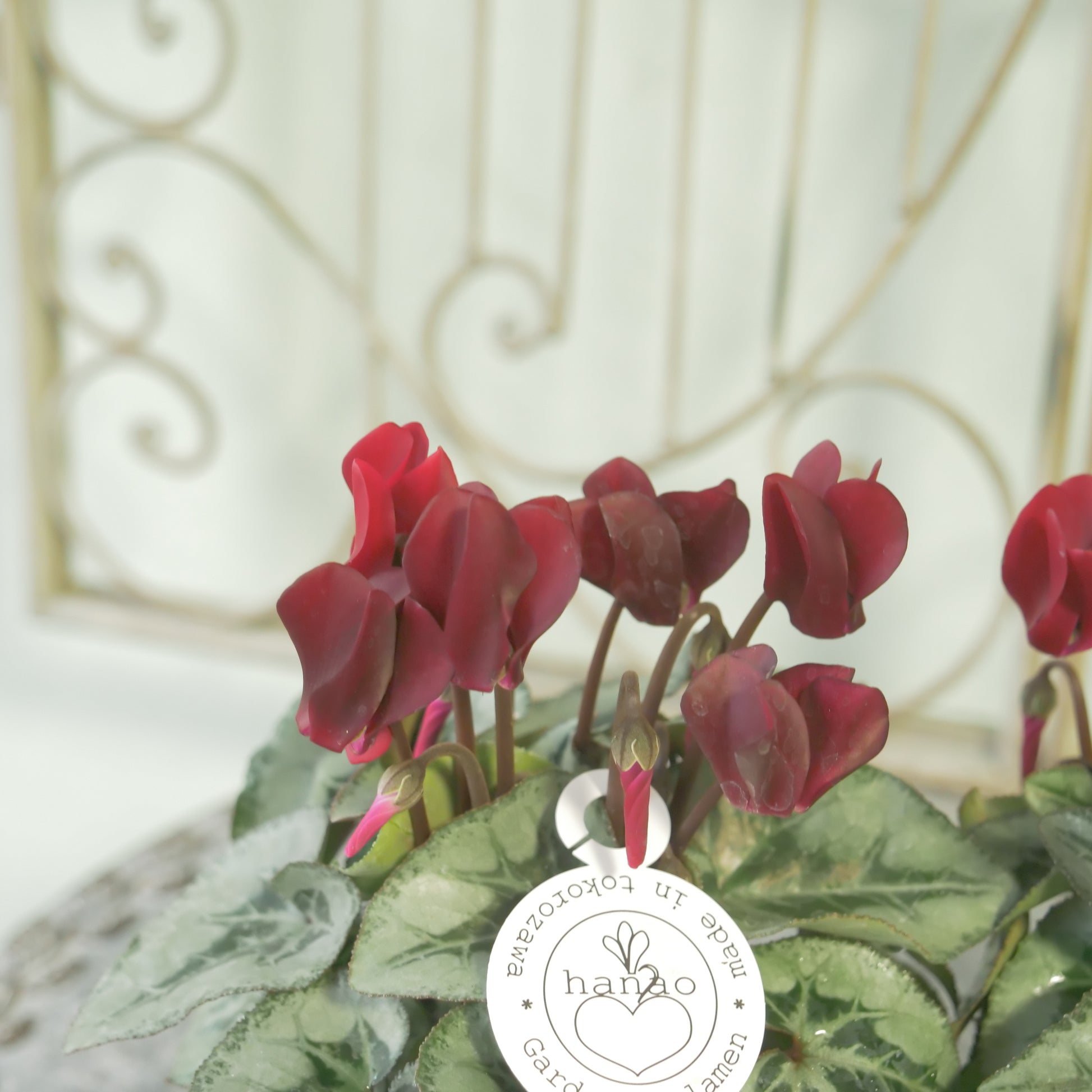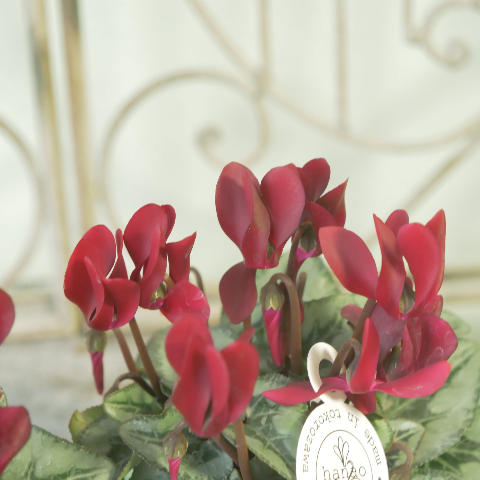 こちらは、花越さんが生産された、シクラメンです。寄せ植えに使いやすいサイズで仕立てられています。埼玉県の花越さんの生産されたシクラメンは、とっても良い株なんですよ✨シルバー系の葉に、スッとした茎、シックな花色が素敵なシクラメンです。寄せ植えに使うと可愛いです🌸