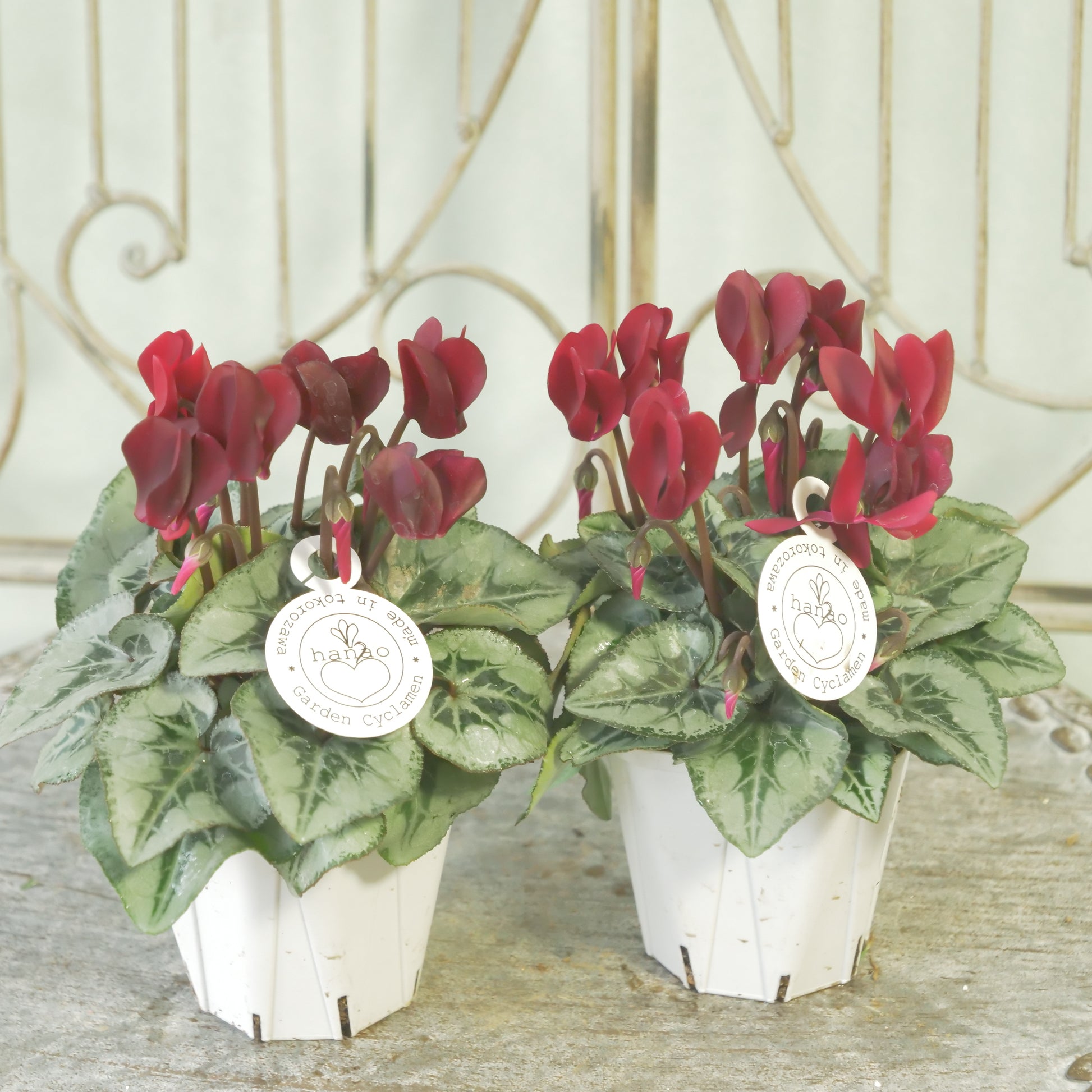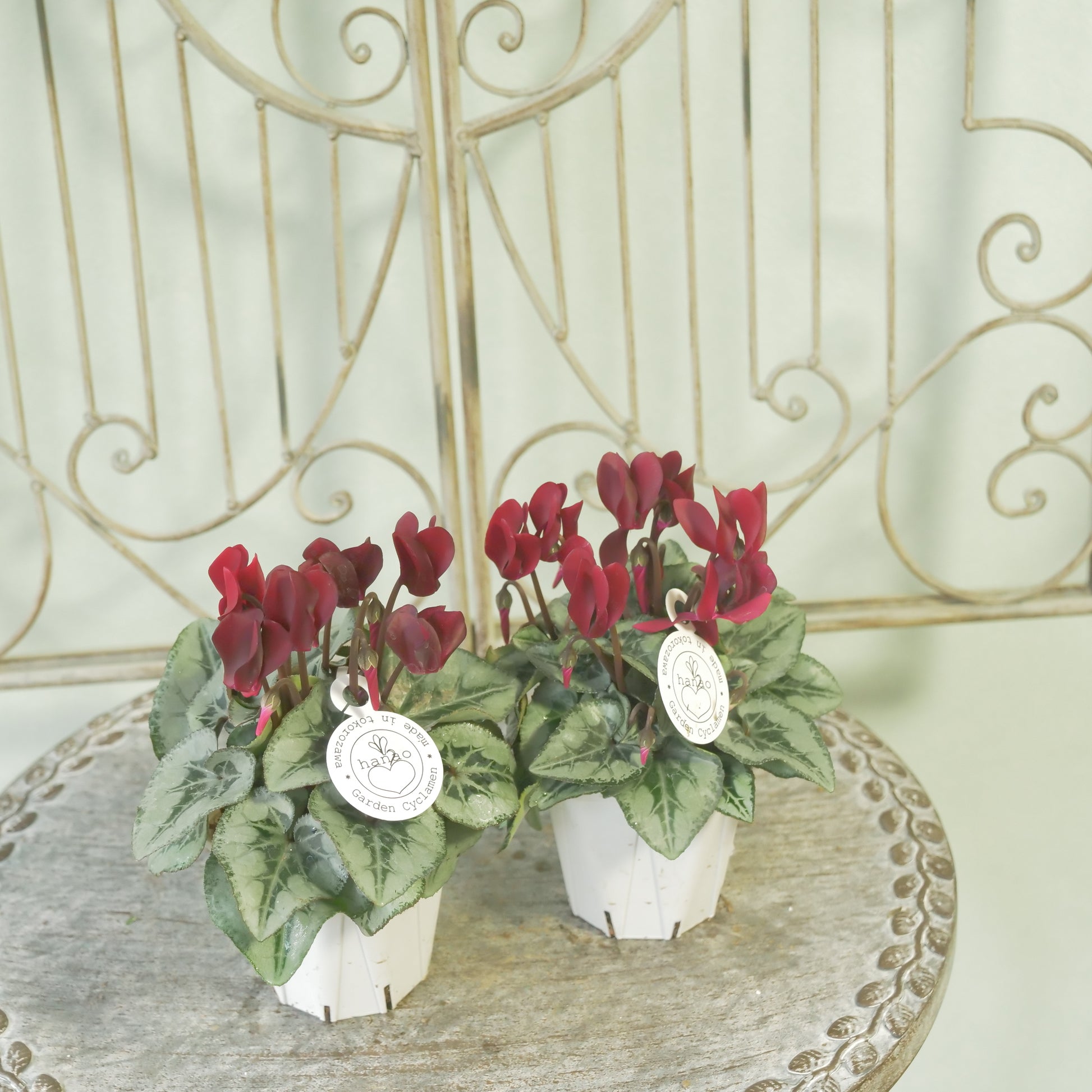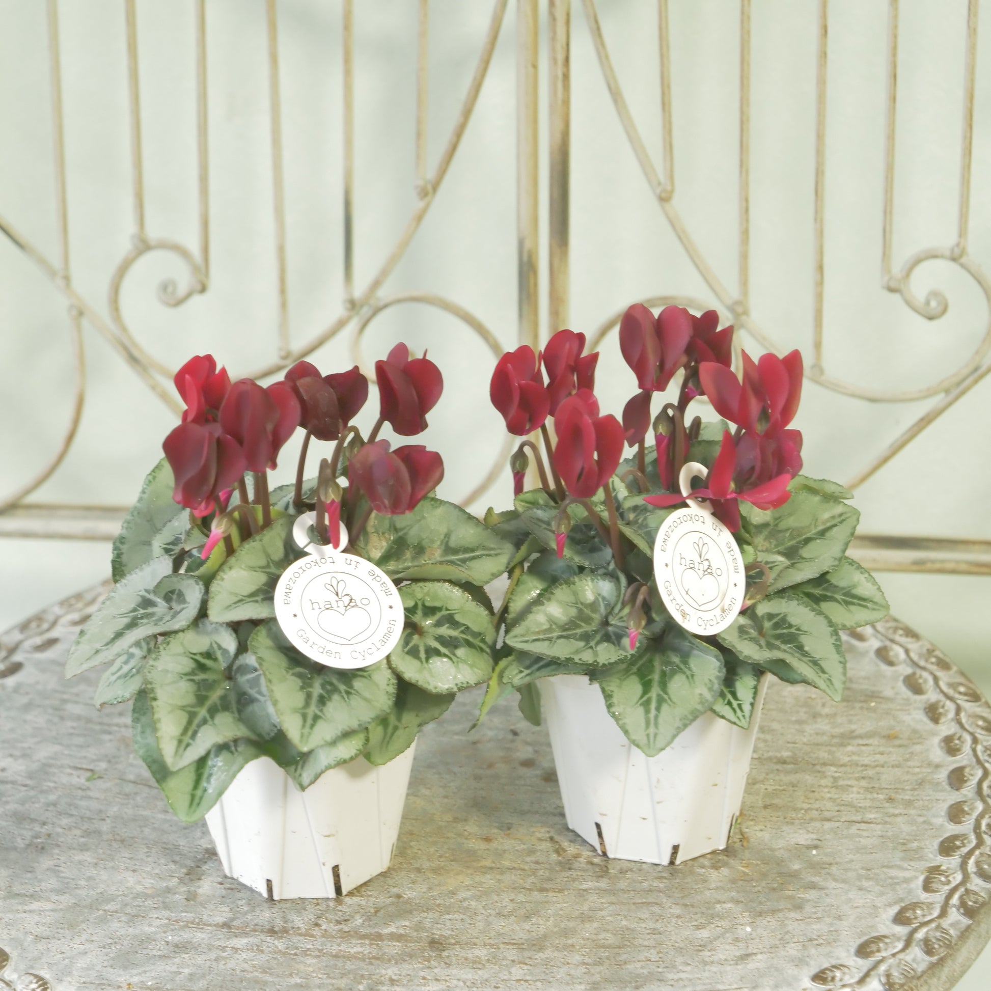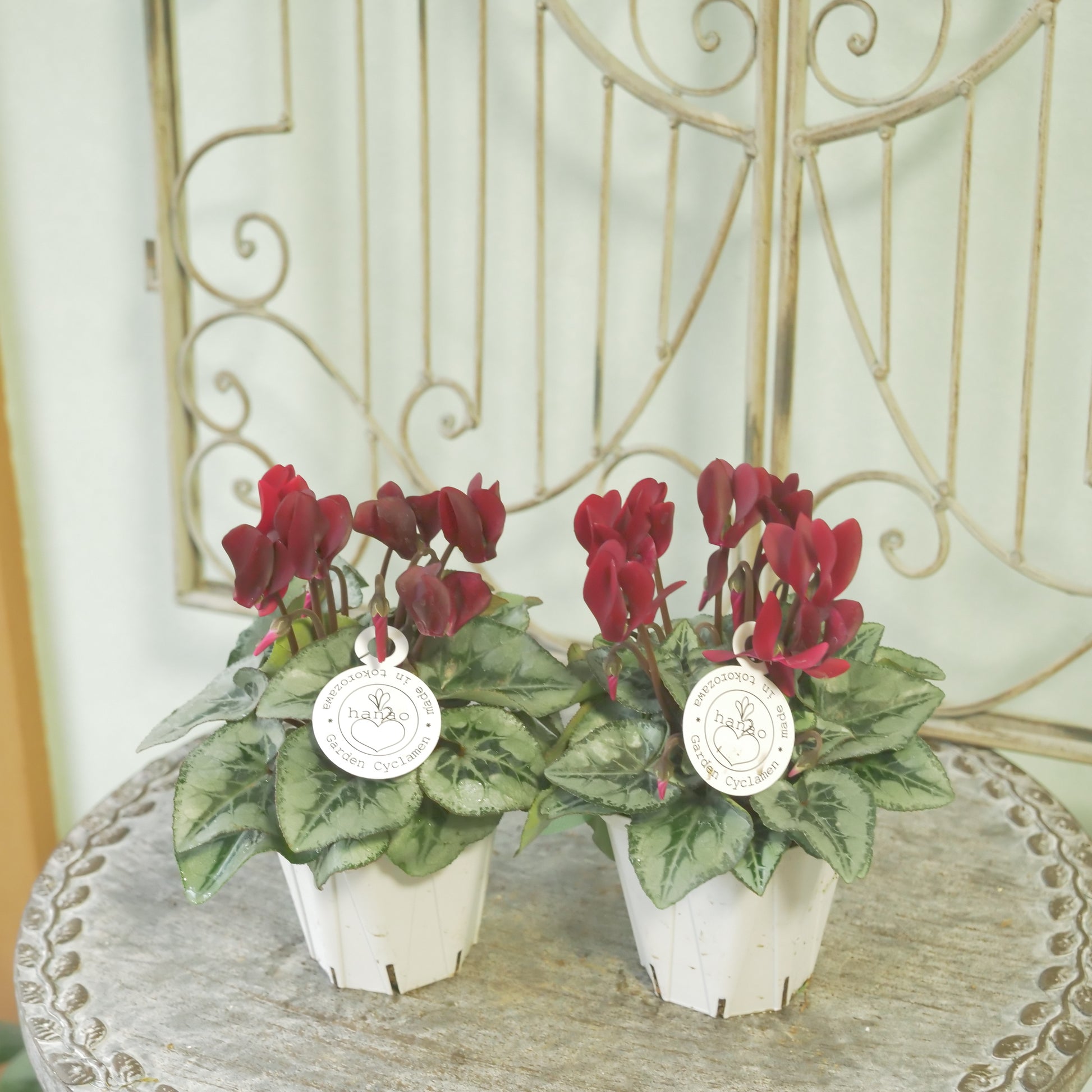 こちらは、花越さんが生産された、シクラメンです。寄せ植えに使いやすいサイズで仕立てられています。埼玉県の花越さんの生産されたシクラメンは、とっても良い株なんですよ✨シルバー系の葉に、スッとした茎、シックな花色が素敵なシクラメンです。寄せ植えに使うと可愛いです🌸