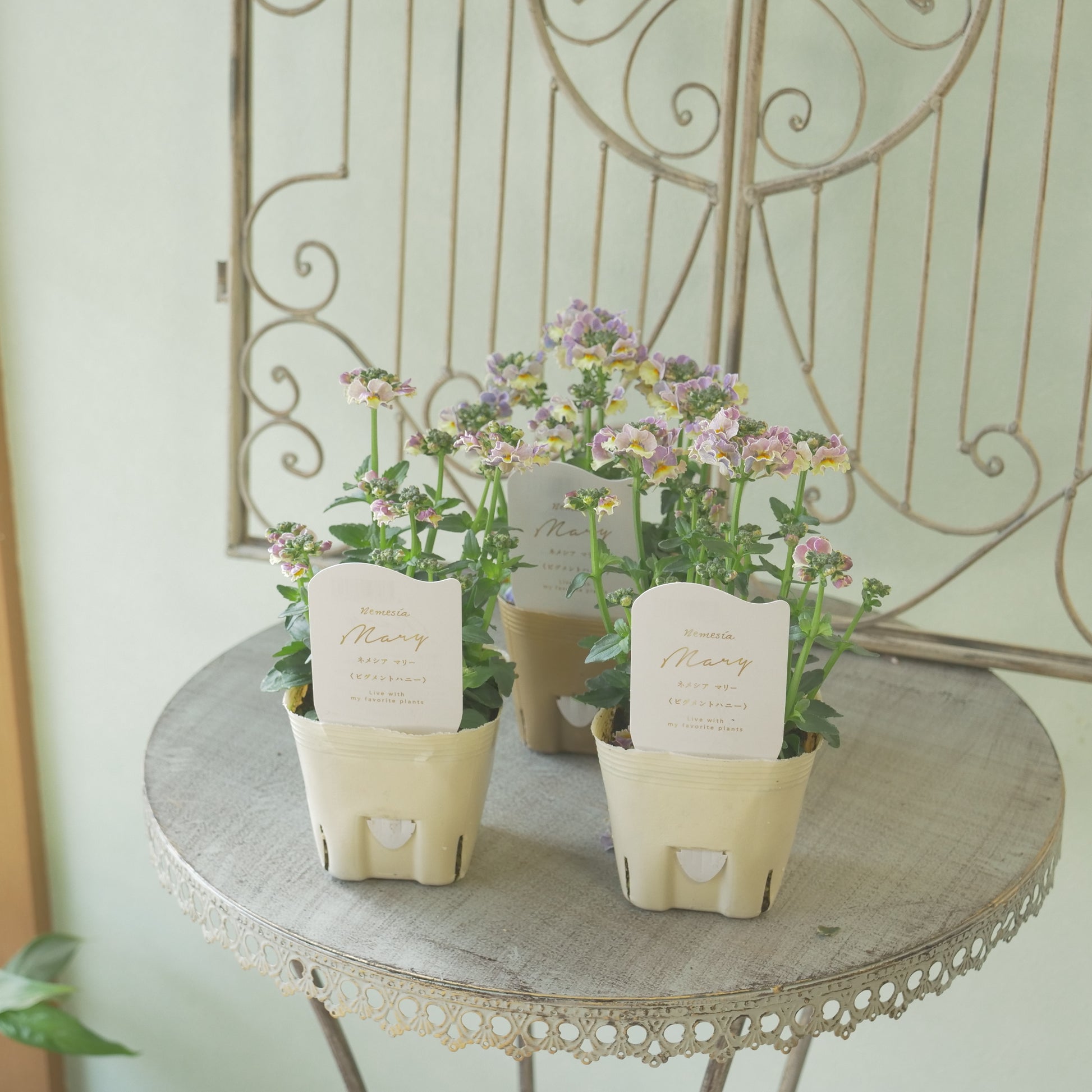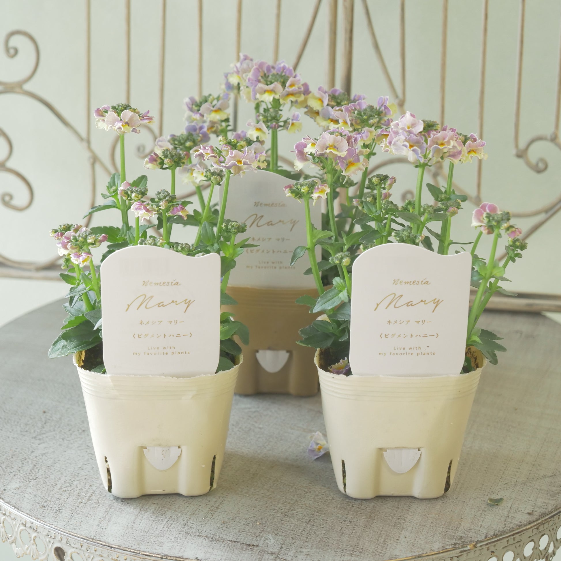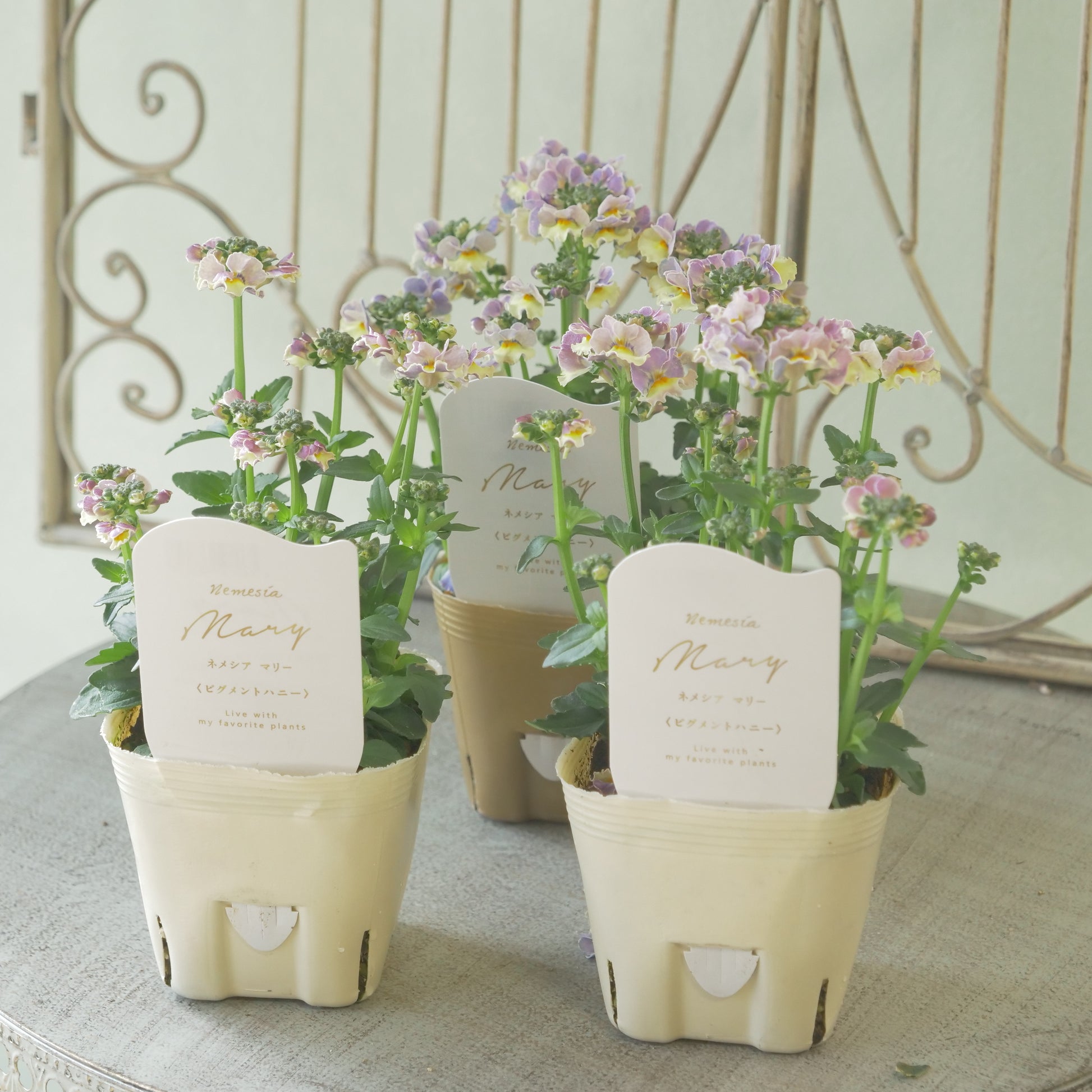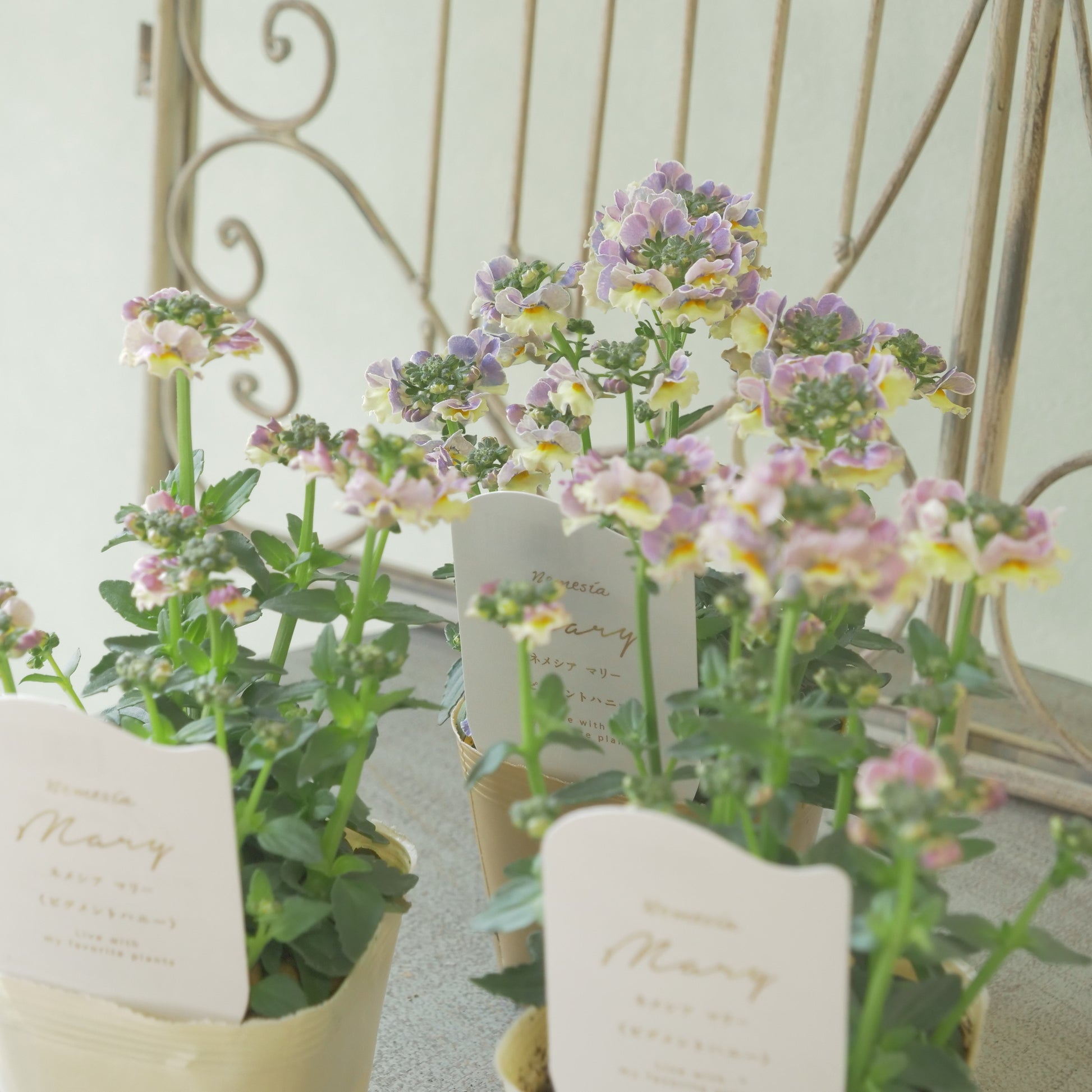 こちらは、花芳さんオリジナルのネメシアです。寄せ植えに使いやすいよう、2株で植えられていますので、分割して使う事ができます。ネメシアマリーは、葉や花が固く、しっかりとしていますので、他のネメシアよりも長持ちする印象です。そして性質も強いので、安心して寄せ植えにも使っていただけると思います。花が終わりましたら、切り戻しておくと、再度お花を咲かせてくれます。
