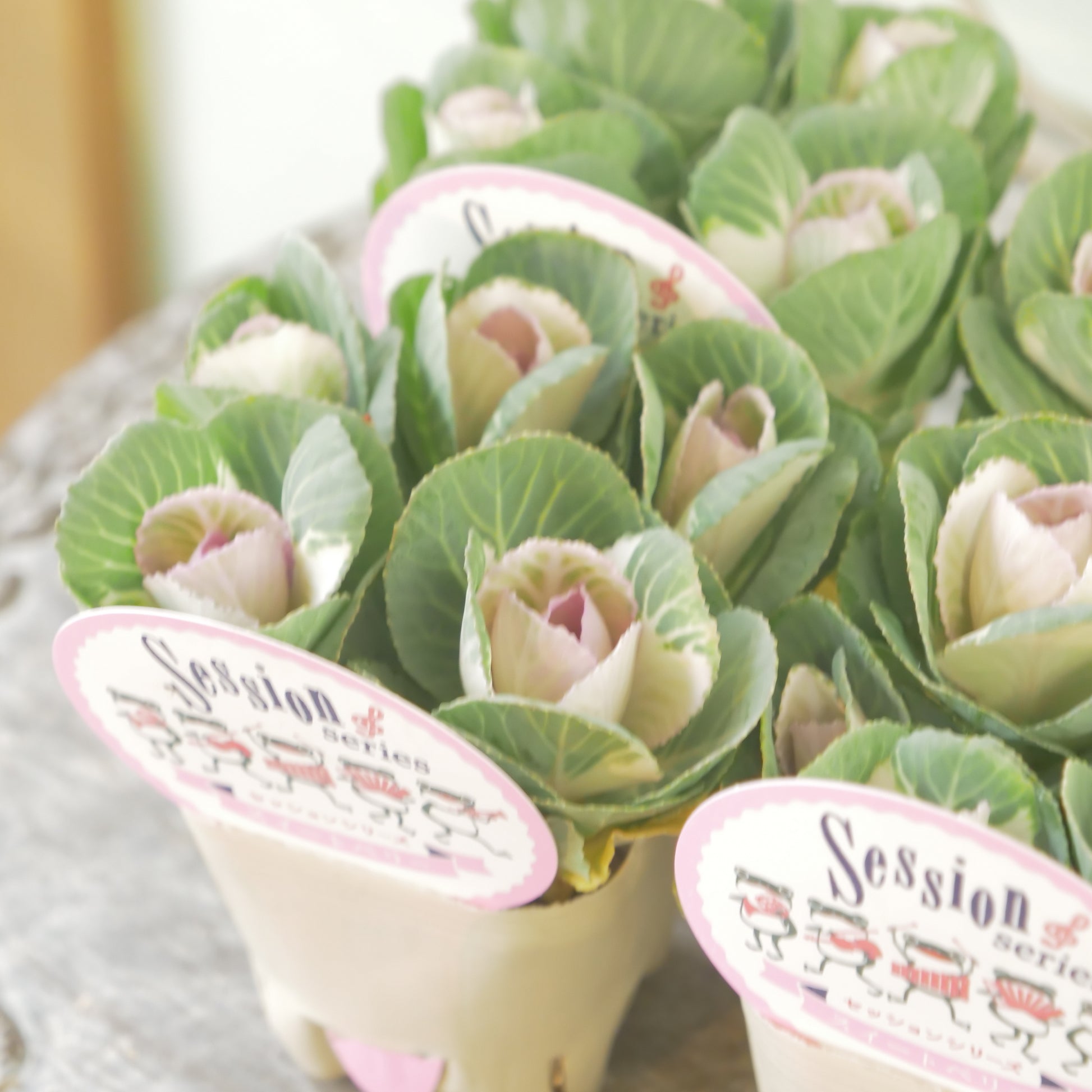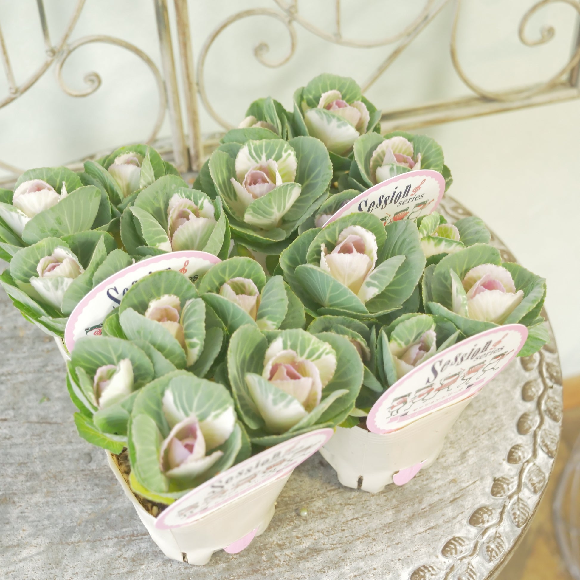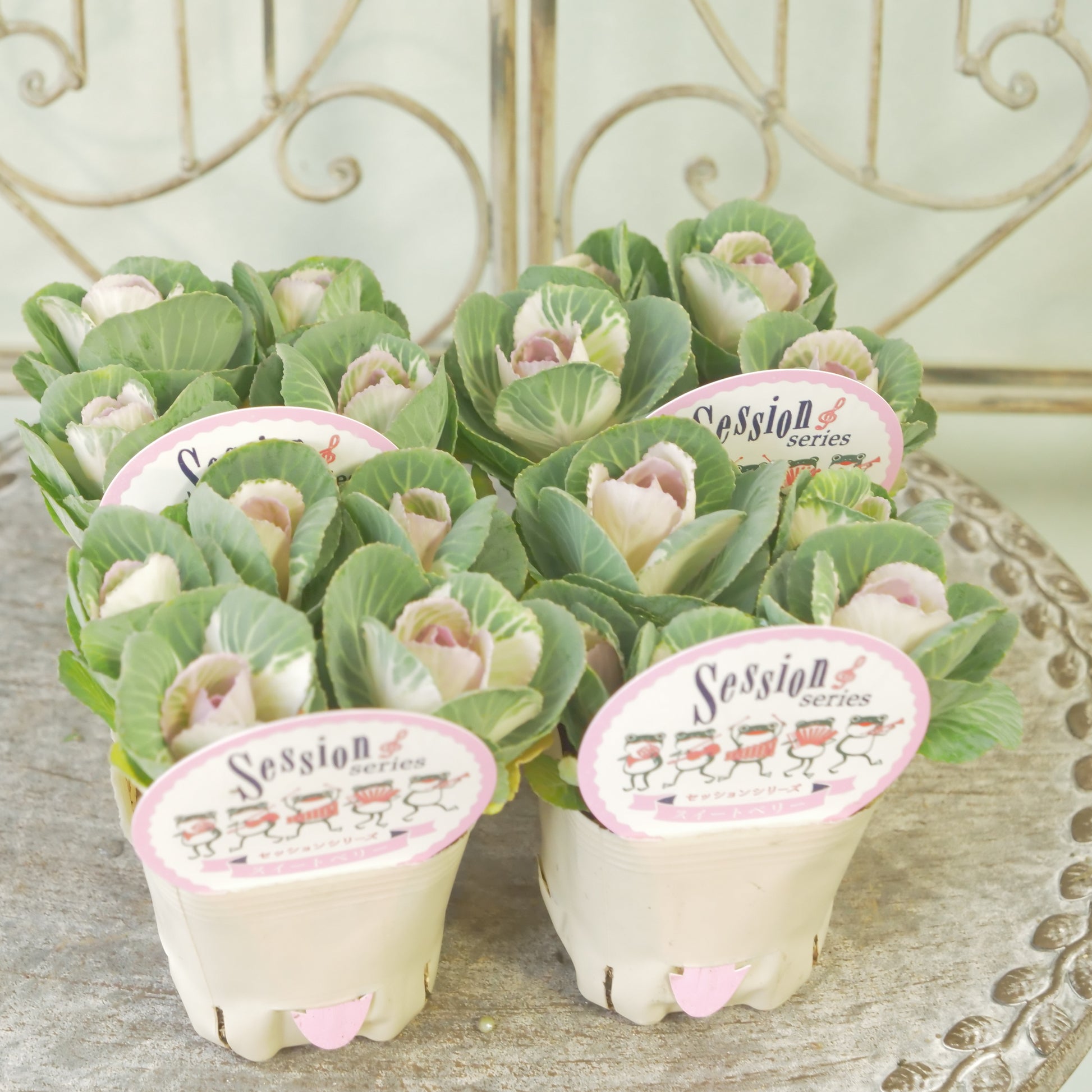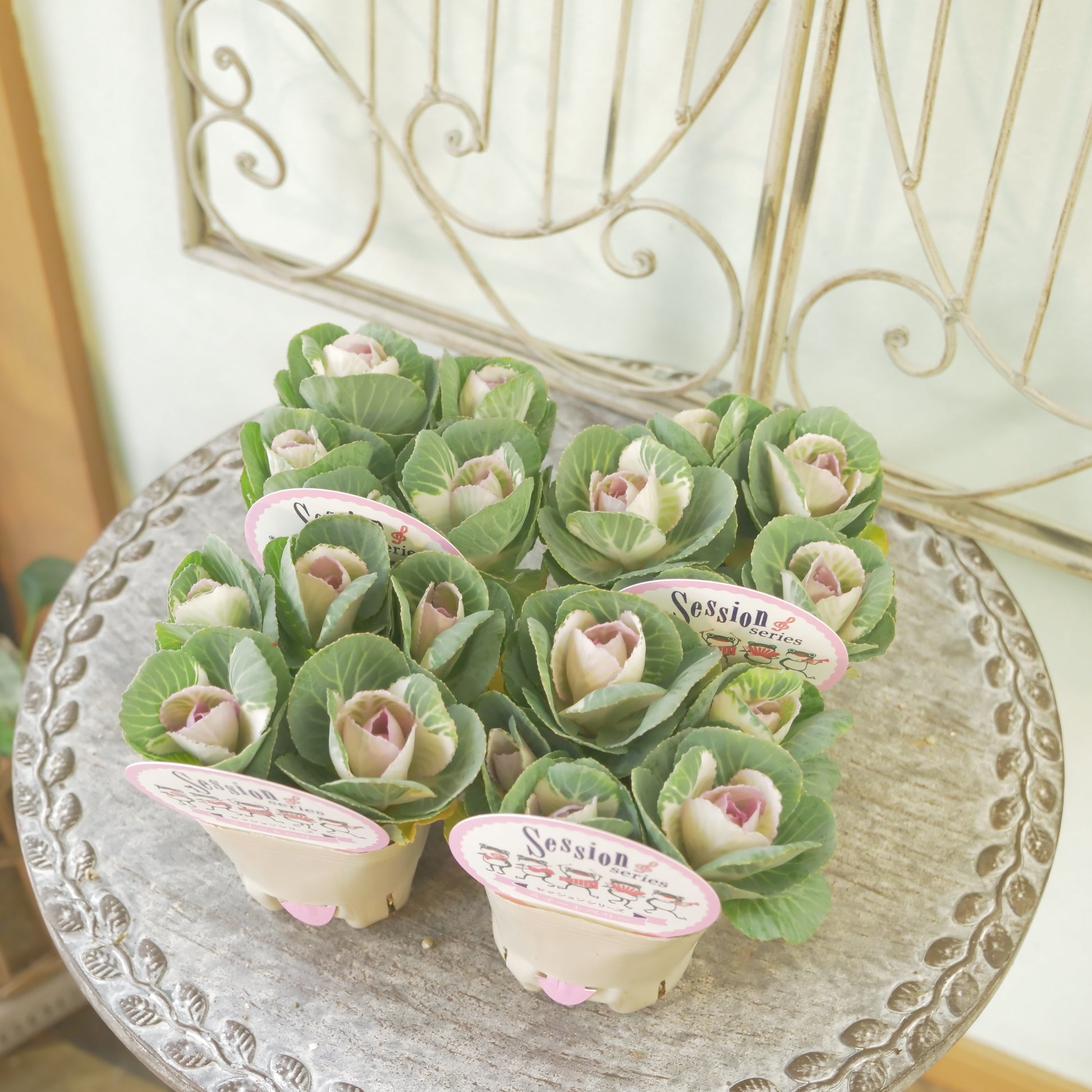 こちらは、冬の庭、花壇、寄せ植えにおススメの、高見園芸さんオリジナルハボタン【セッションシリーズ】です。色と葉が、かなり可愛いハボタンです。引き締まっていて、とても良い株です!4~5本ほど植えてありますので、ばらして使う事もできます。そのまま植えても可愛いですよ✨耐寒性もあり、これからの季節におススメです。
