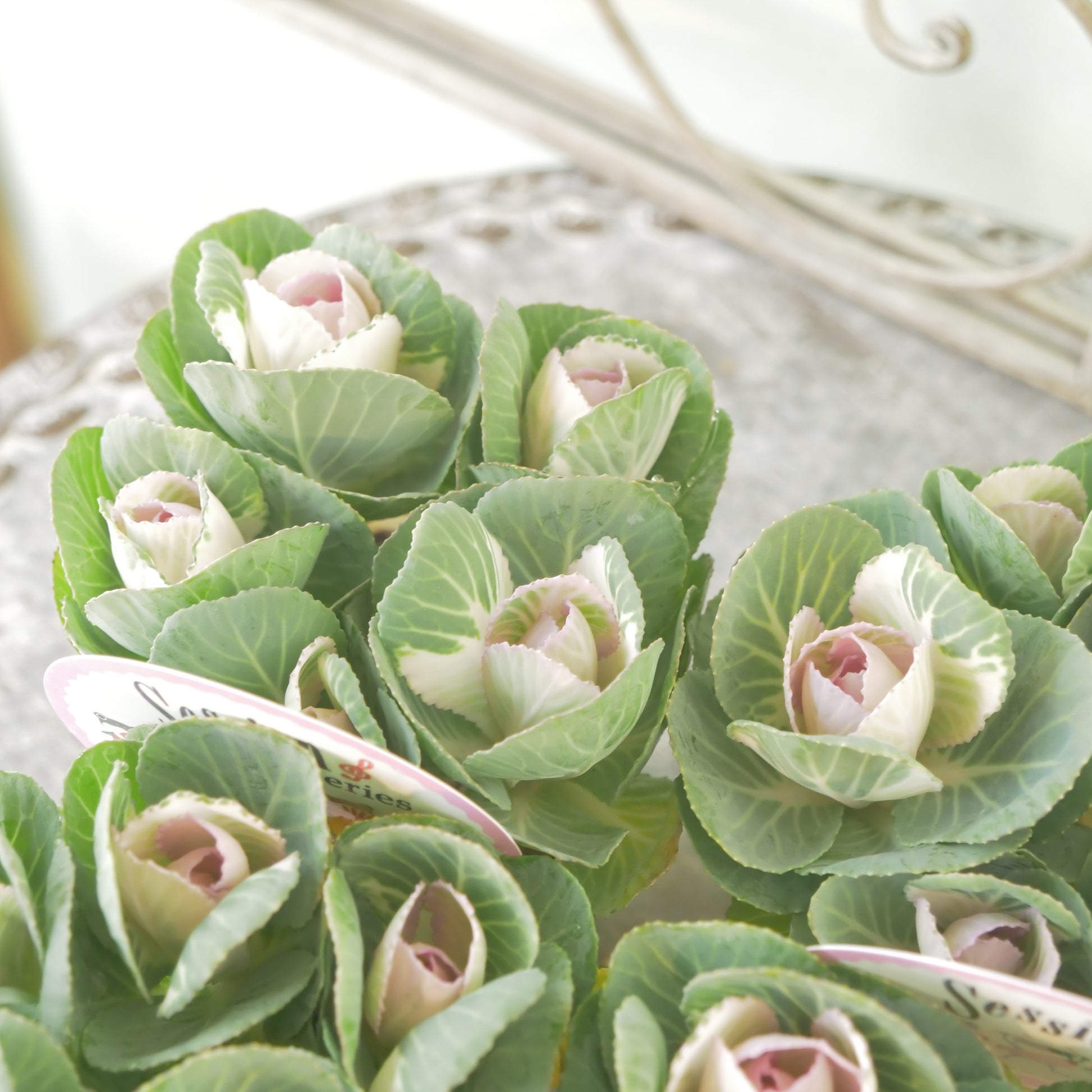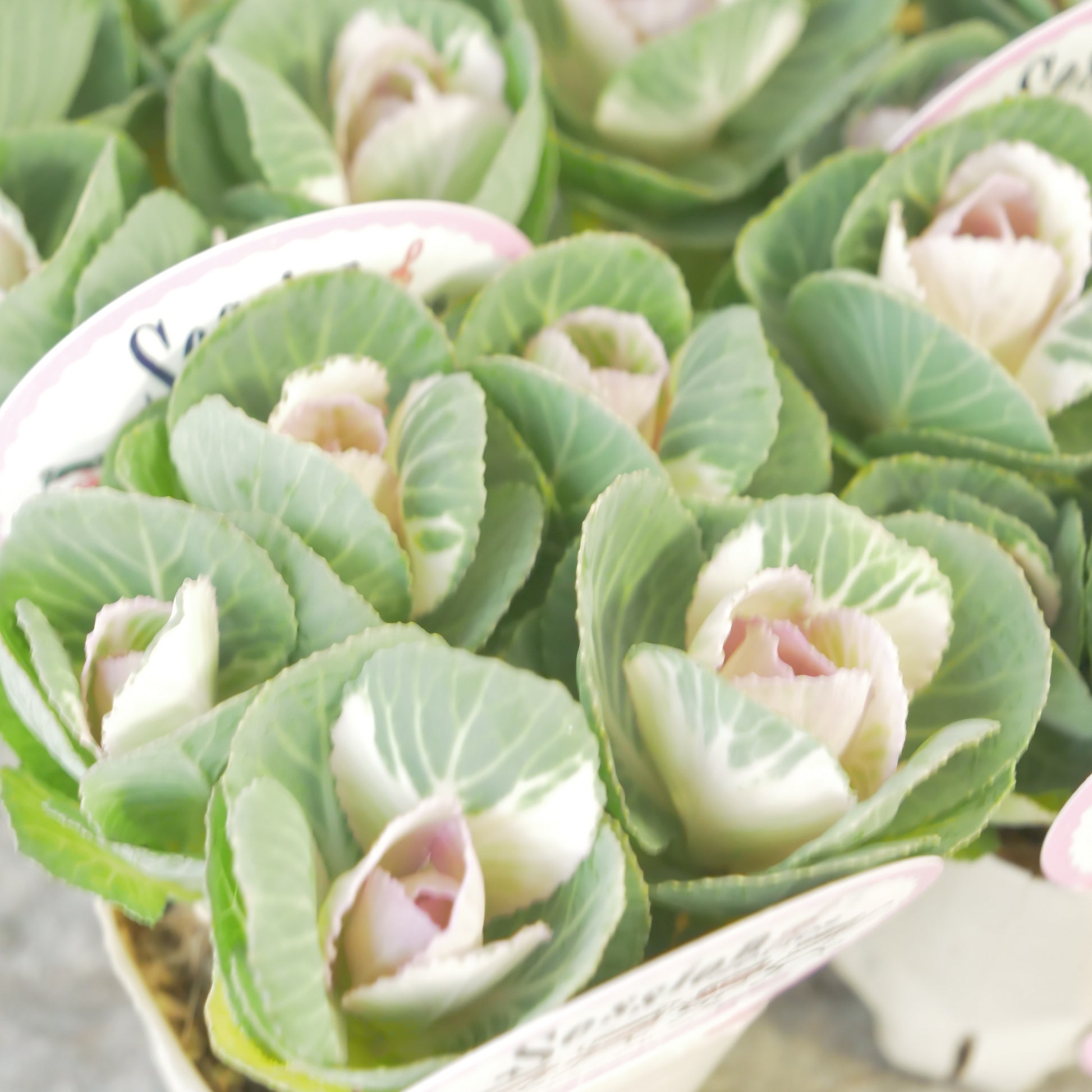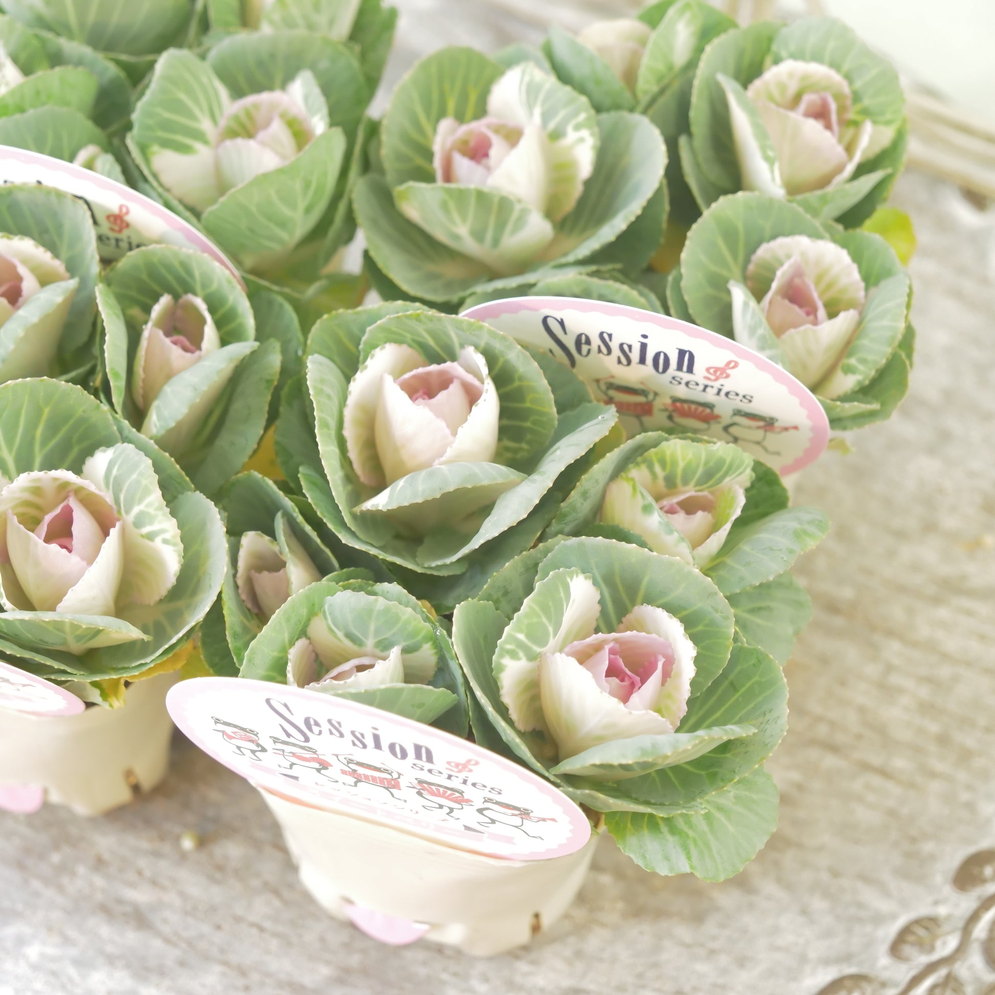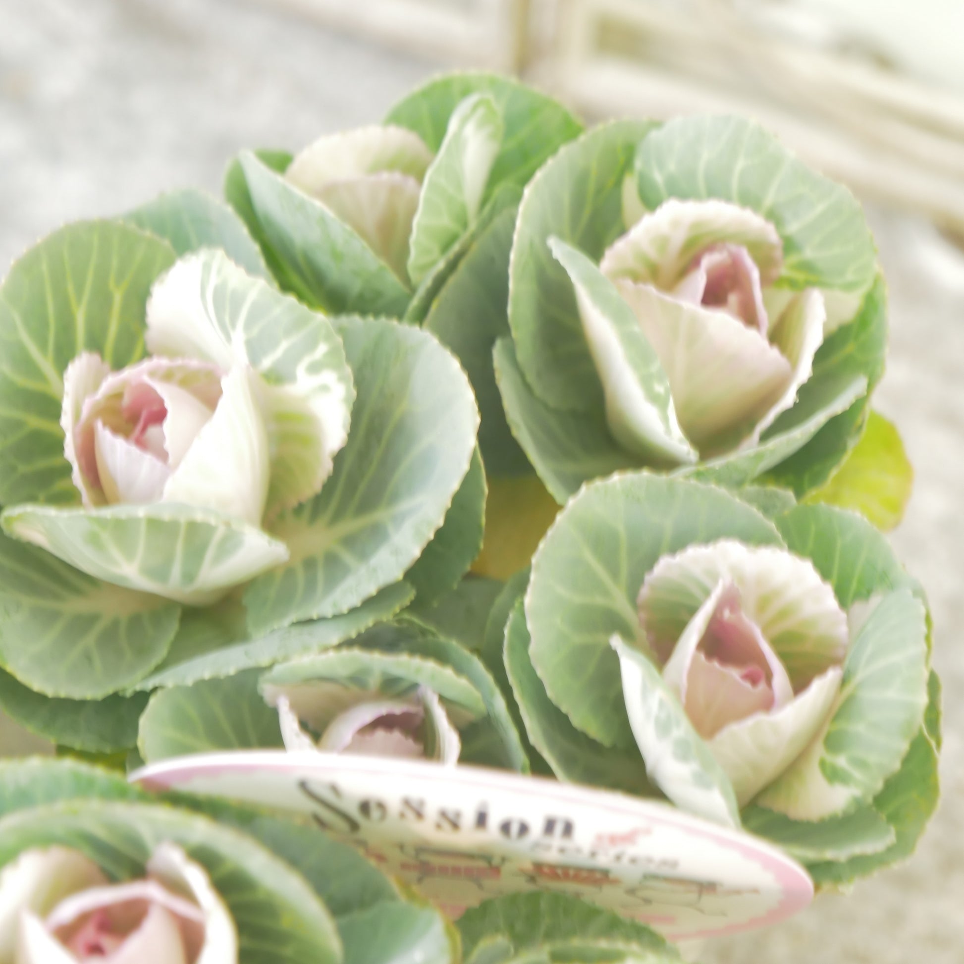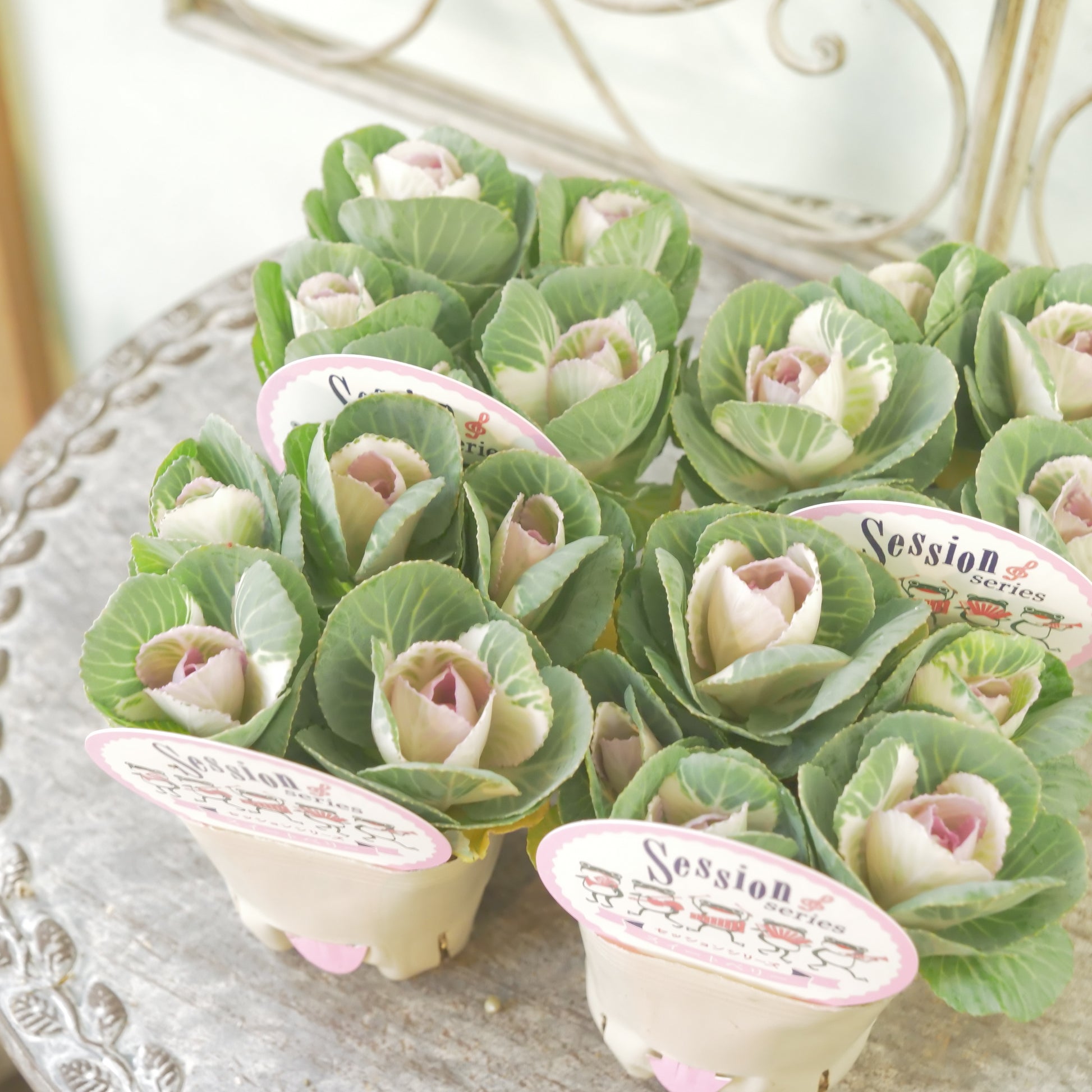 こちらは、冬の庭、花壇、寄せ植えにおススメの、高見園芸さんオリジナルハボタン【セッションシリーズ】です。色と葉が、かなり可愛いハボタンです。引き締まっていて、とても良い株です!4~5本ほど植えてありますので、ばらして使う事もできます。そのまま植えても可愛いですよ✨耐寒性もあり、これからの季節におススメです。