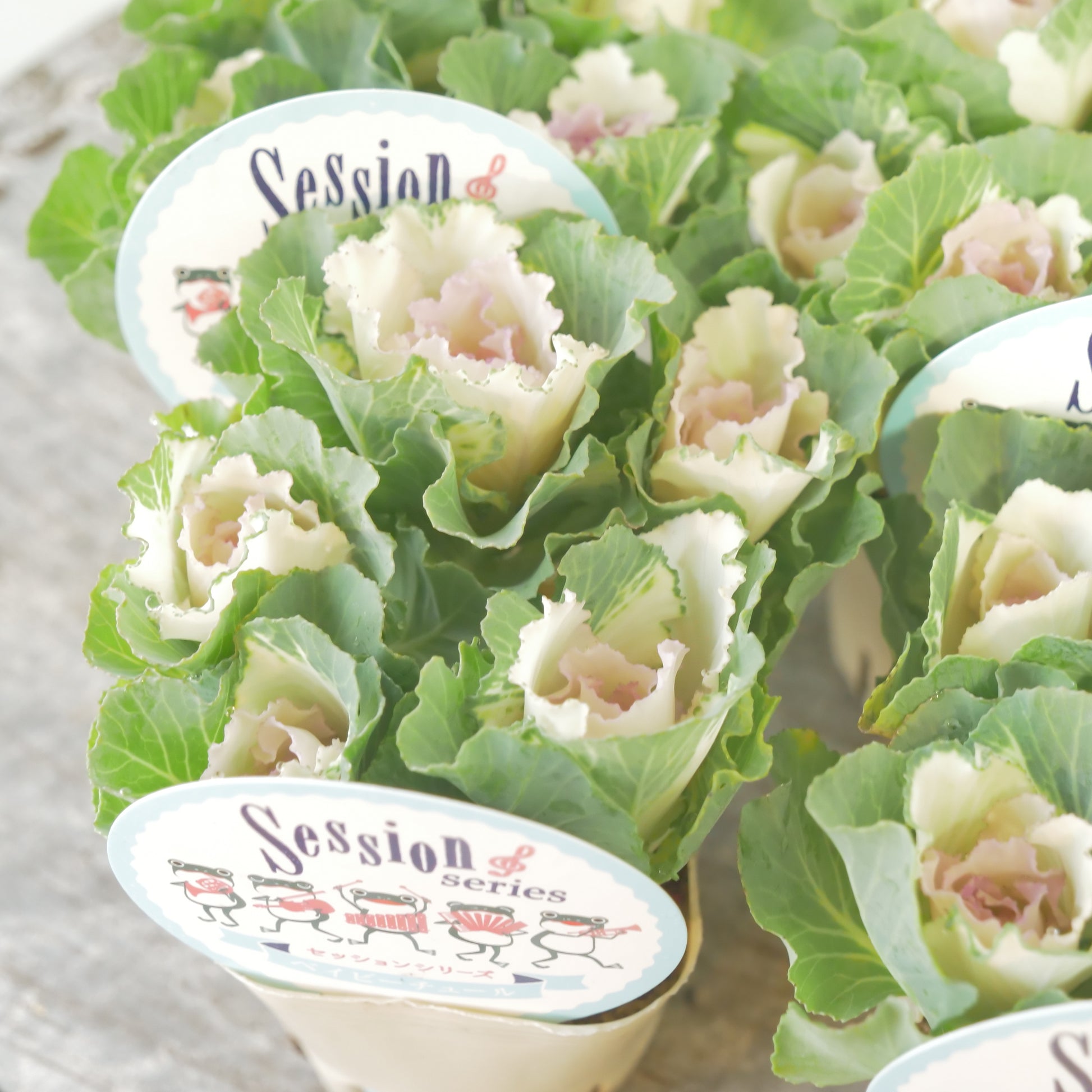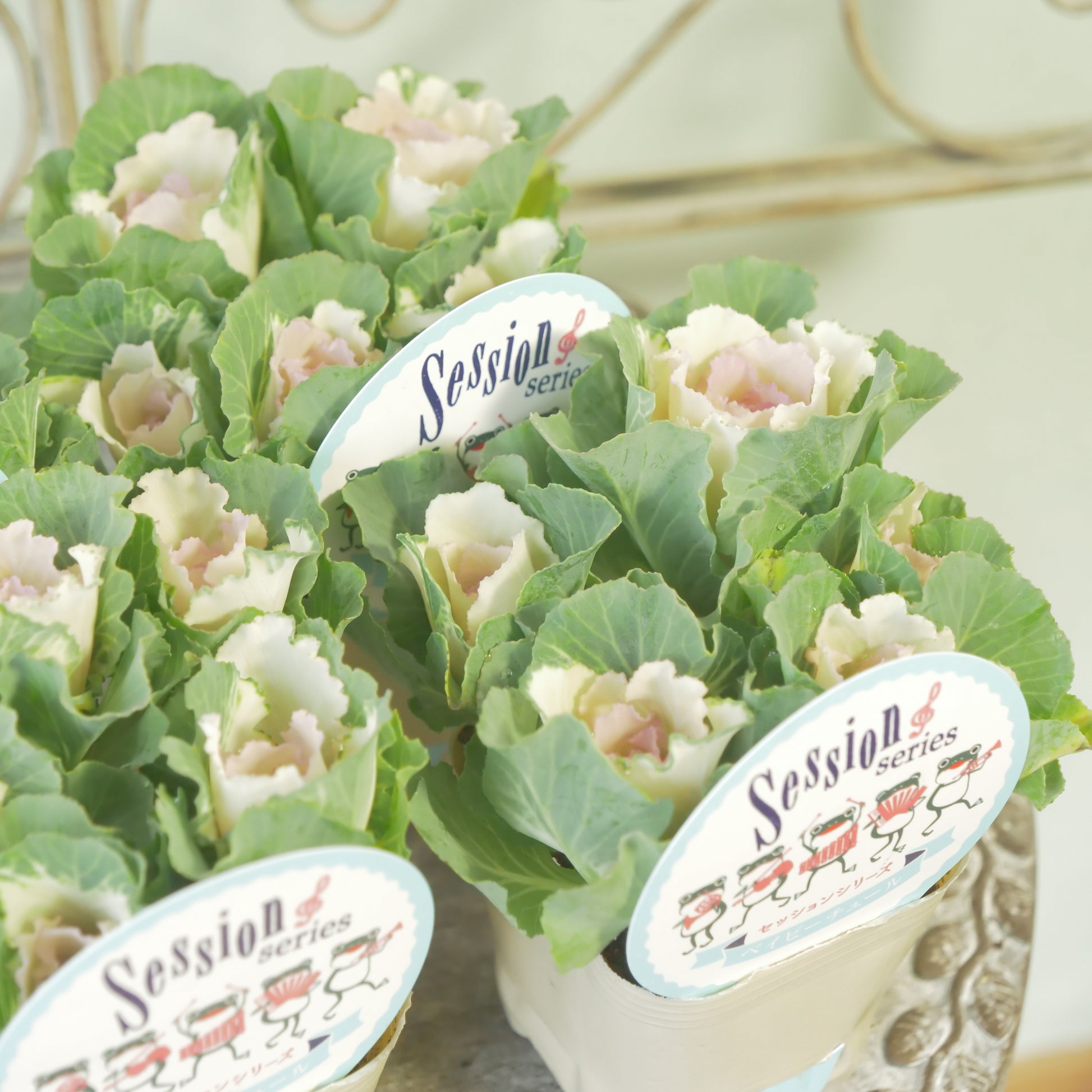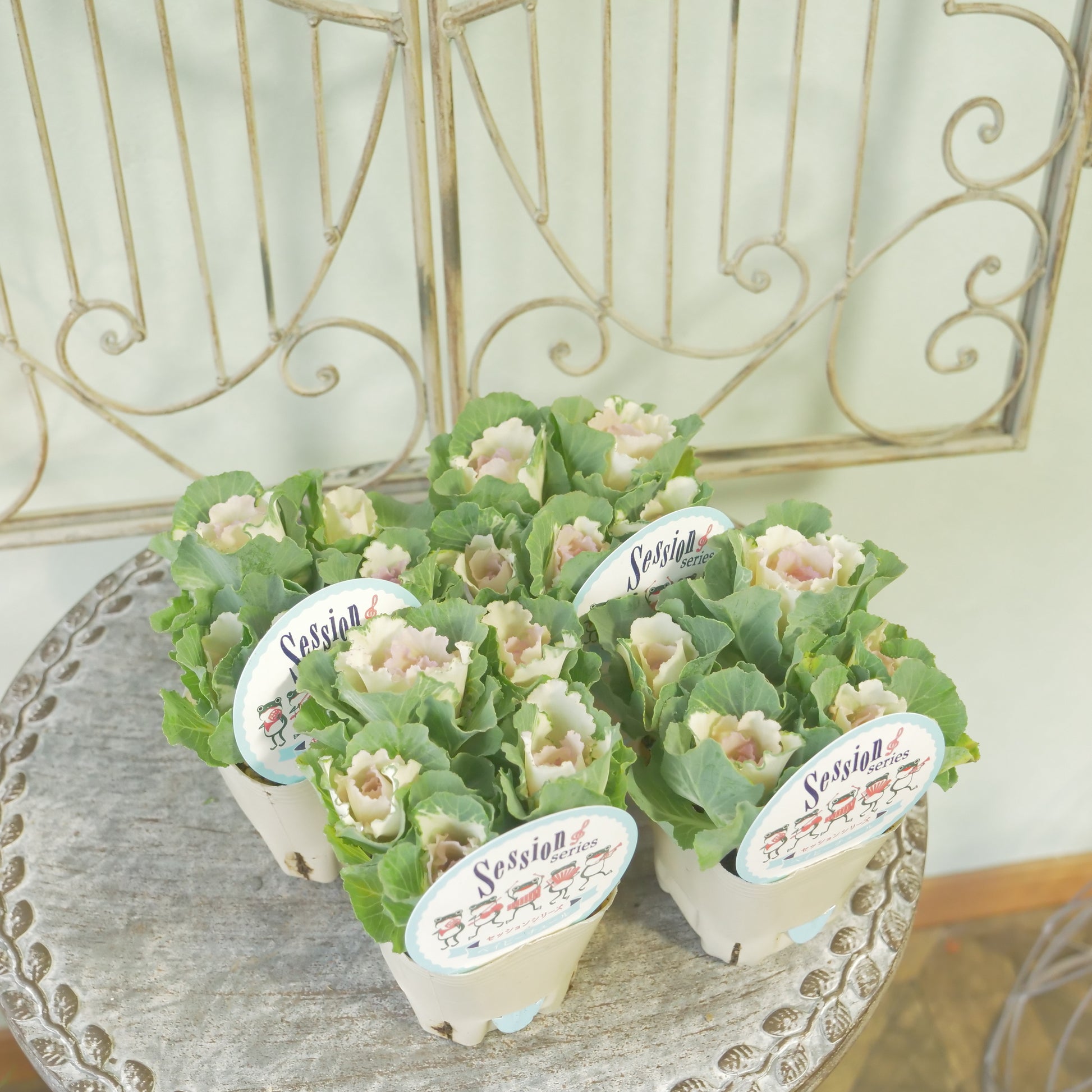 こちらは、冬の庭、花壇、寄せ植えにおススメの、高見園芸さんオリジナルハボタン【セッションシリーズ】です。色と葉が、かなり可愛いハボタンです。引き締まっていて、とても良い株です!4~5本ほど植えてありますので、ばらして使う事もできます。そのまま植えても可愛いですよ✨耐寒性もあり、これからの季節におススメです。