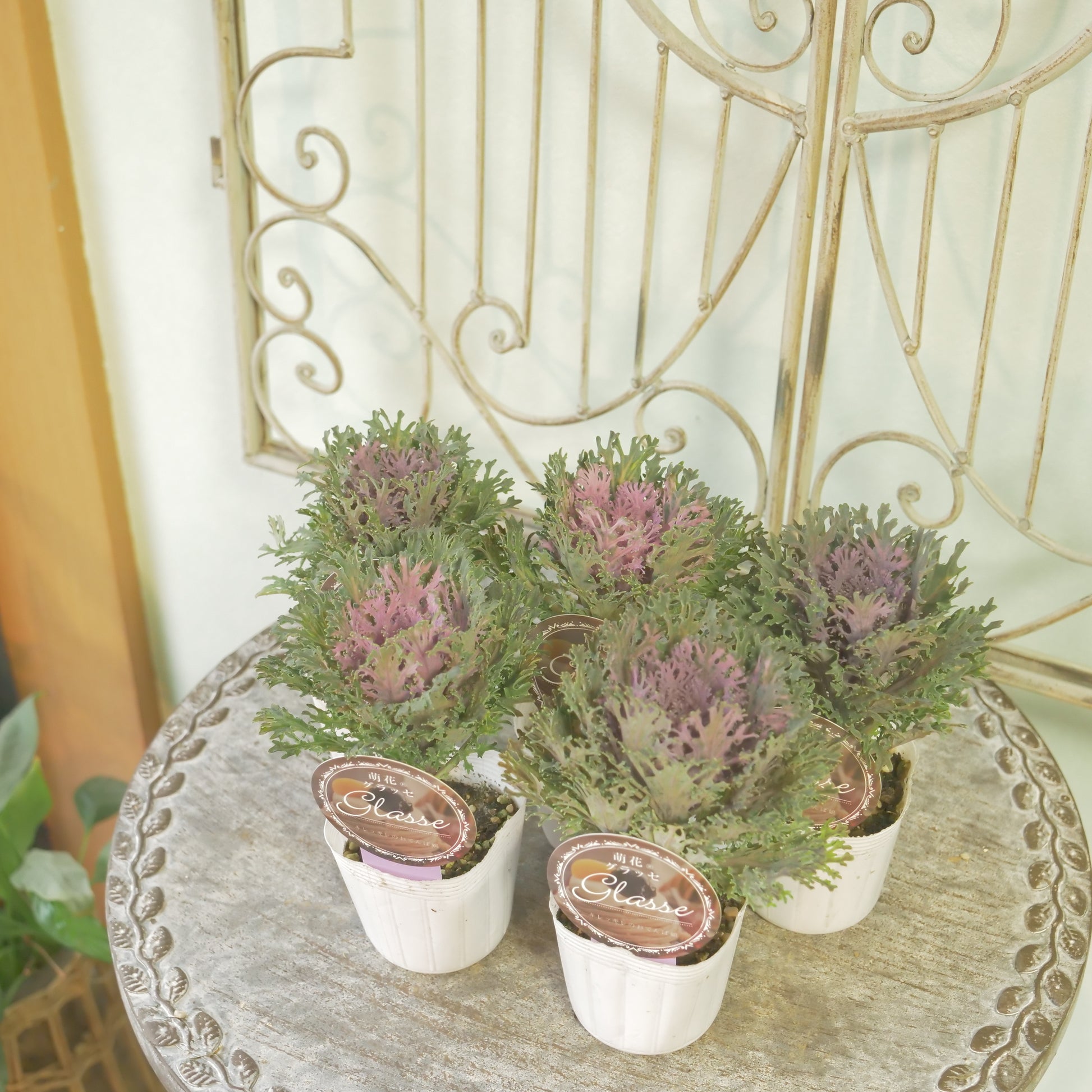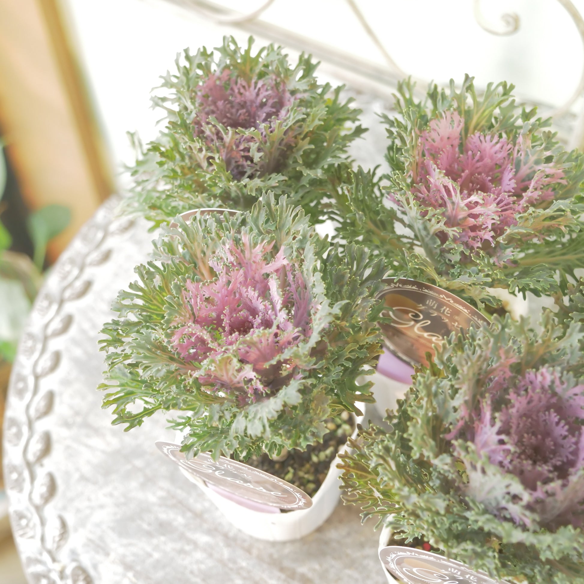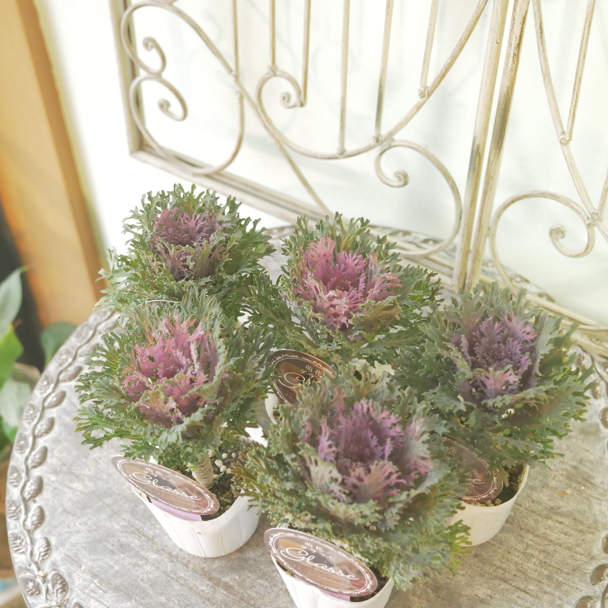 こちらは、冬の庭、花壇、寄せ植えにおススメの、高見園芸さんオリジナルハボタン【萌花】シリーズです。アンティークな葉色がシックでおしゃれなシリーズになります。やや小ぶりの仕立てで、寄せ植えやリースなどに使いやすいです。耐寒性もあり、これからの季節におススメです。