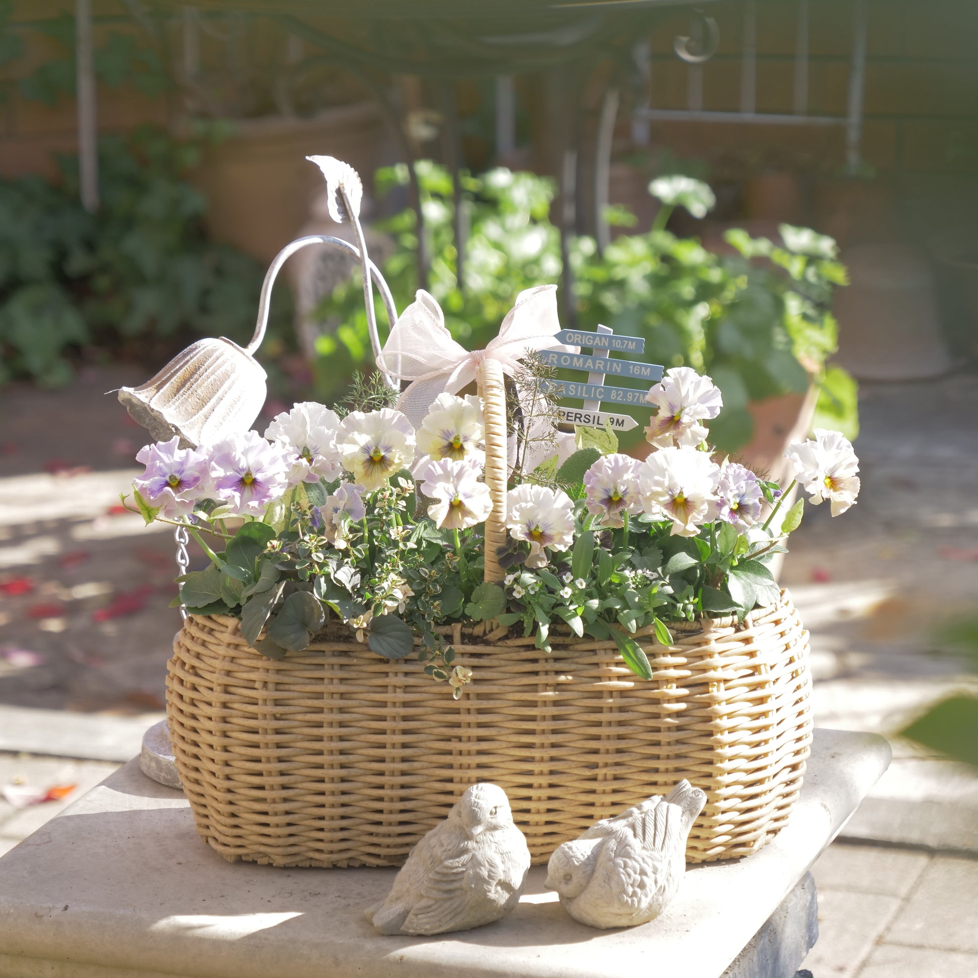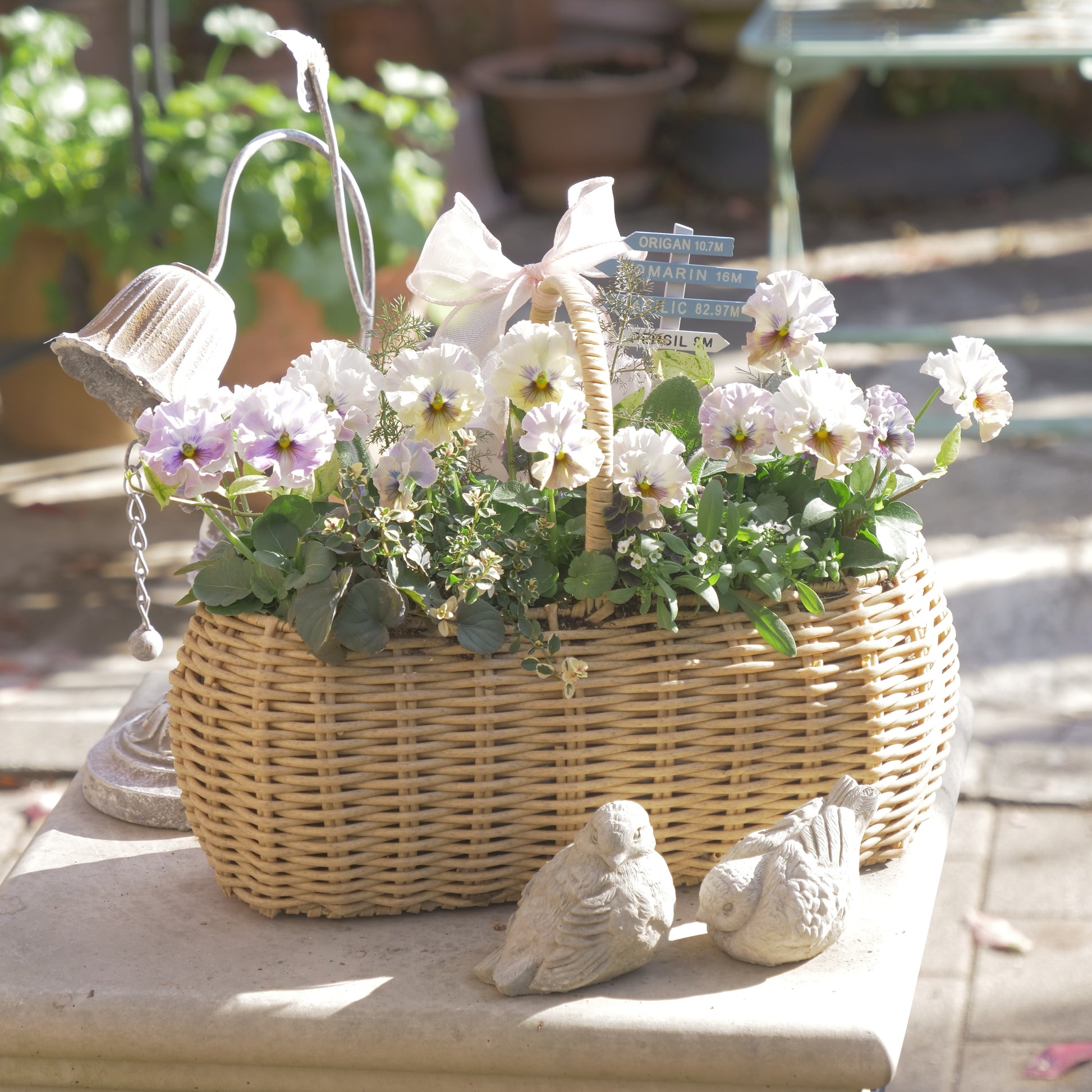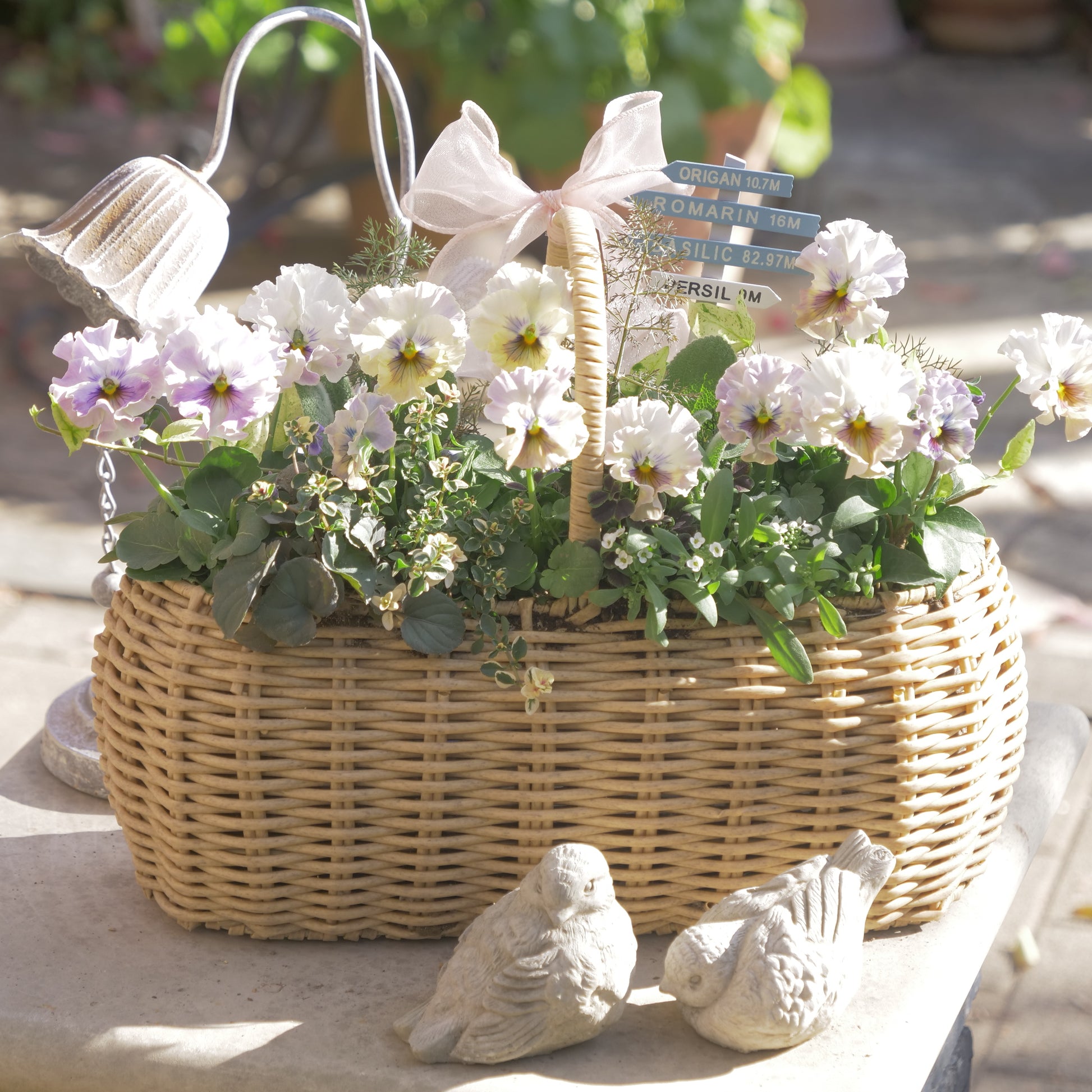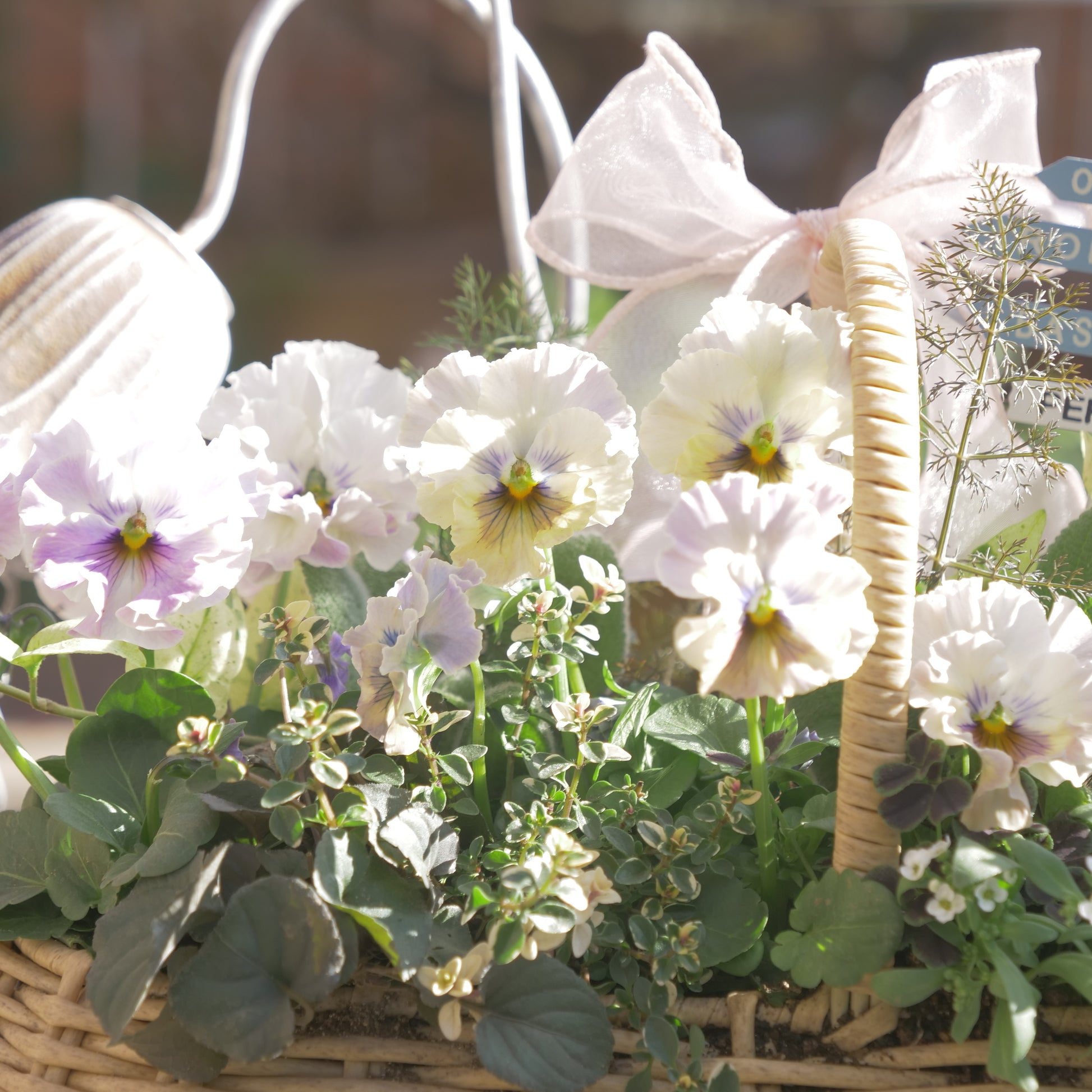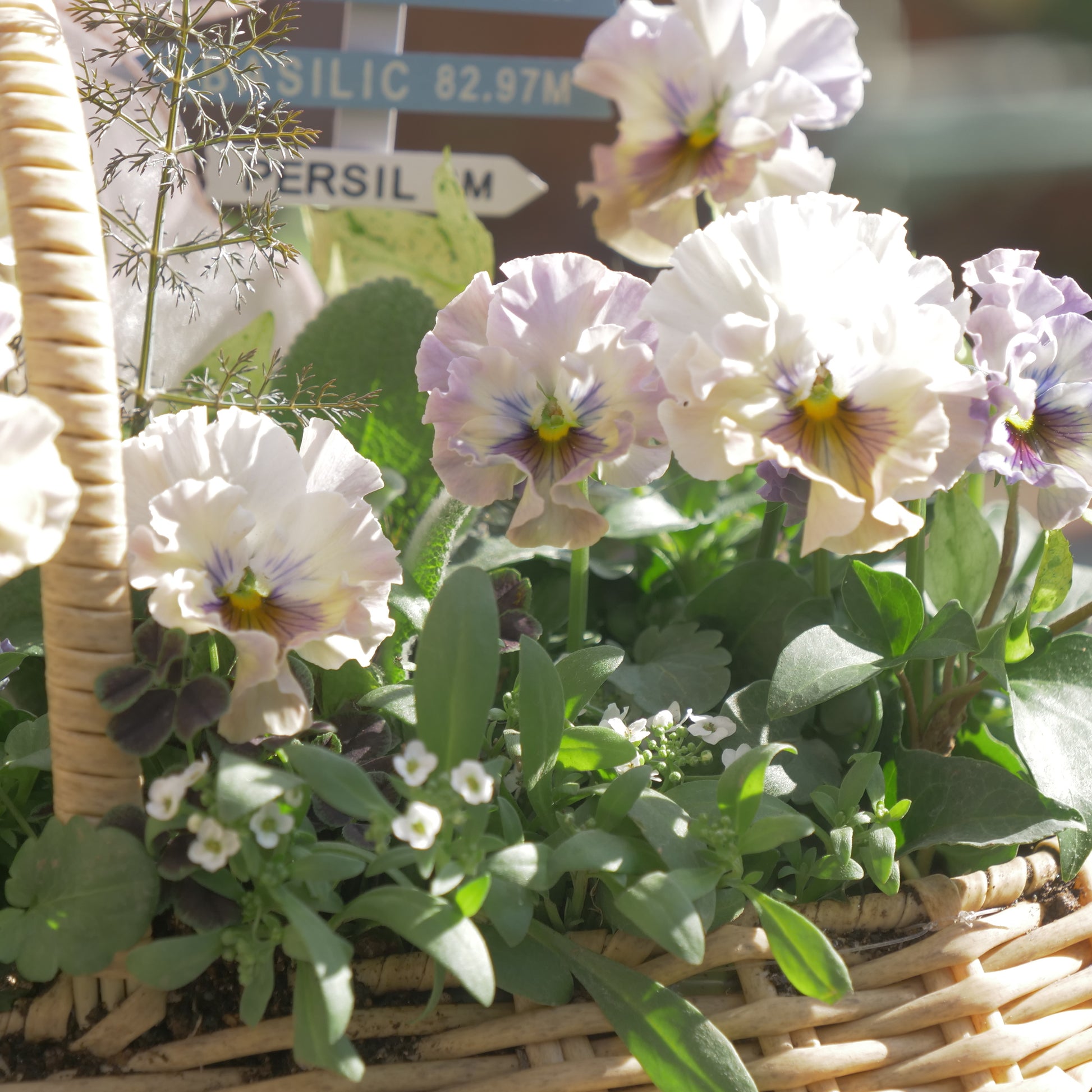 バスケットに植えた、パンジー フェデネージュ トイプーの寄せ植え。