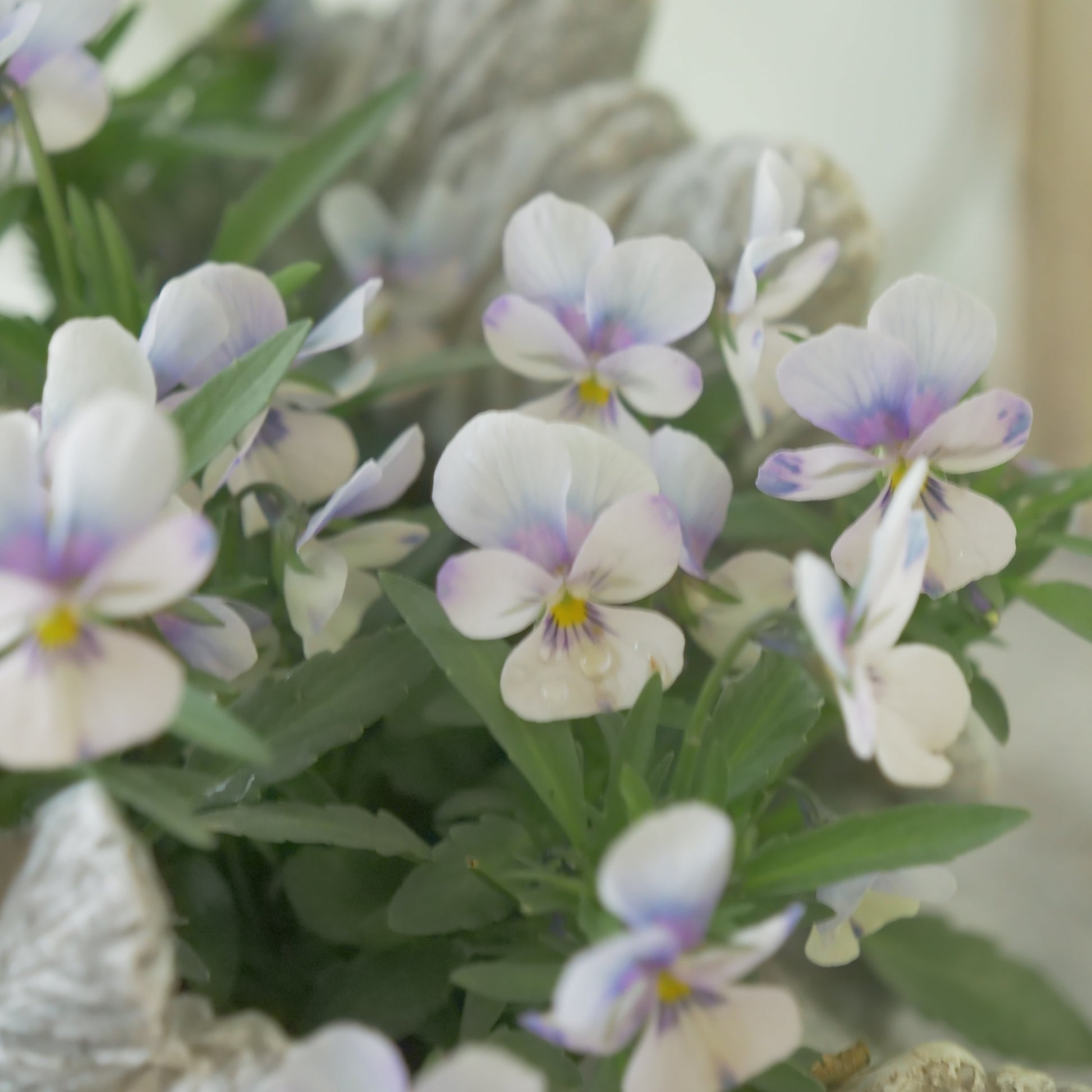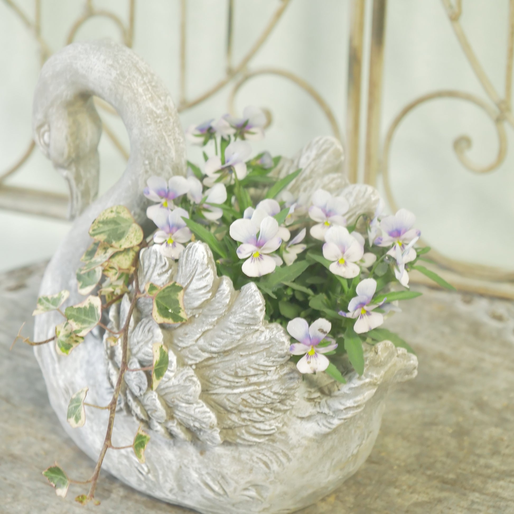 ビオレッタ雫を見た時に、このスワンの鉢に植えたら可愛いだろうなと思い、ふんわりとするまで育てた鉢植えになります。雫はブルーの淡く、そして複雑な花色がとても綺麗で、グレーのスワン鉢ともマッチして良い雰囲気です。スワン鉢はグラスファイバー製なので丈夫です。小さく軽いので、ガーデンテーブルや寄せ植えの側などに置くと可愛いと思います。
