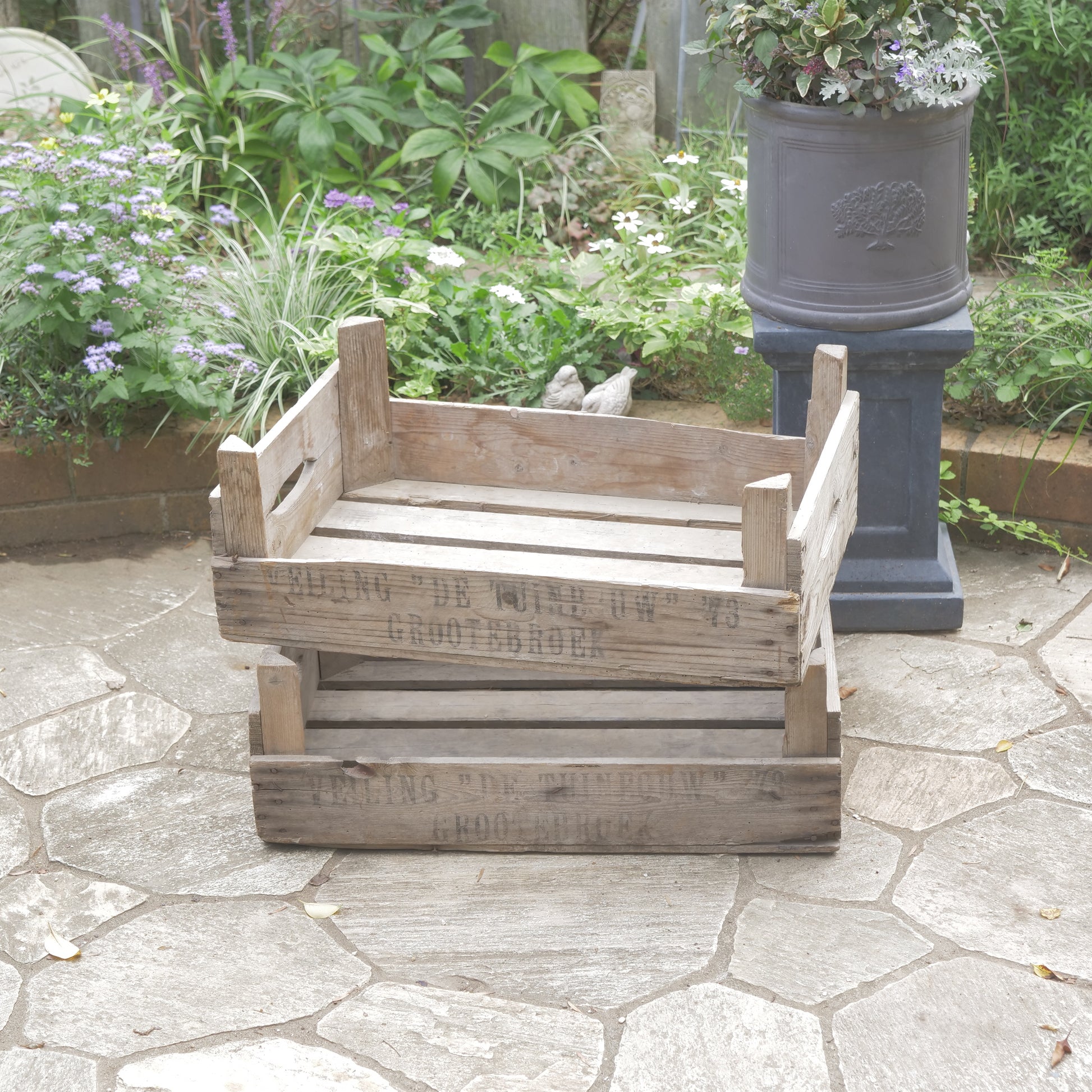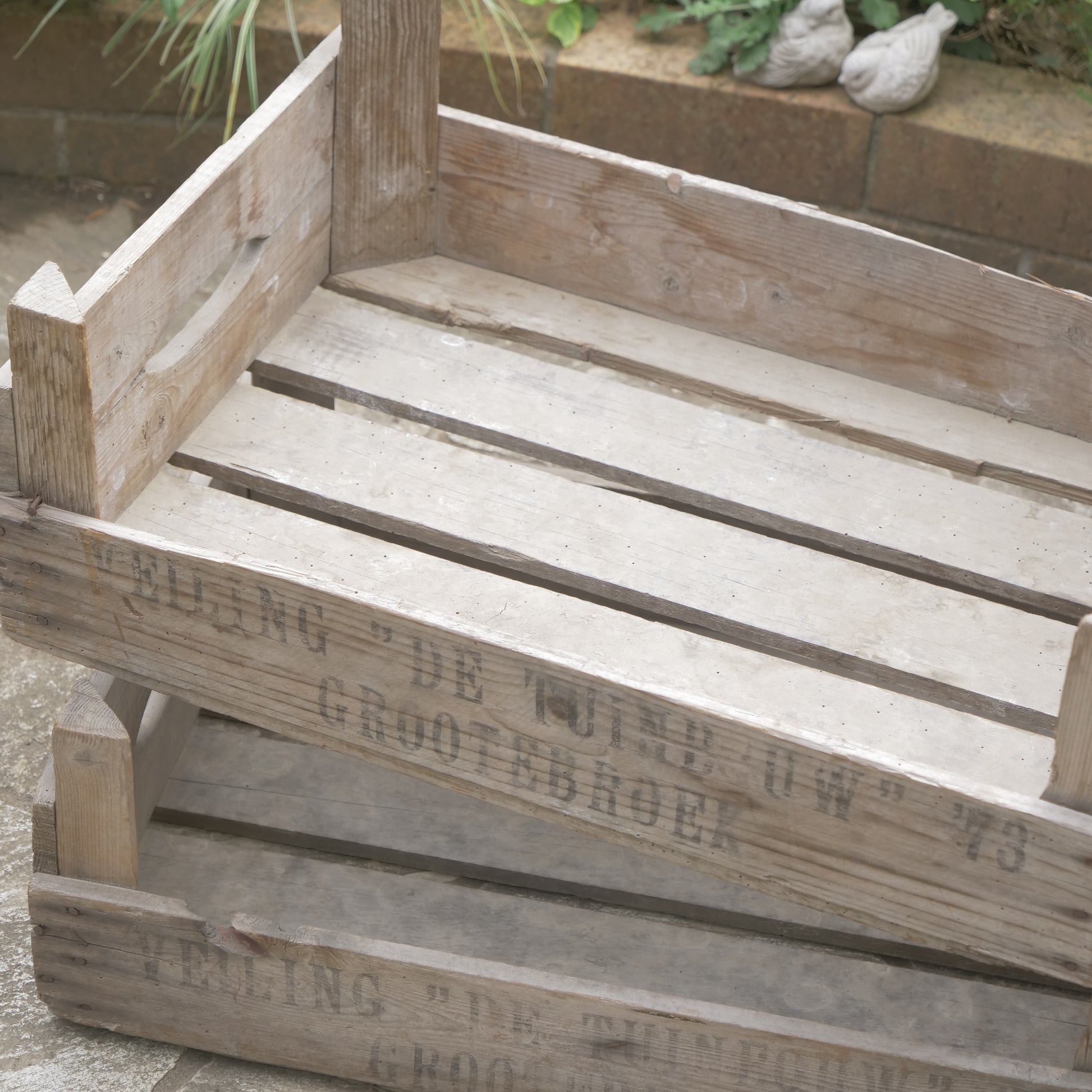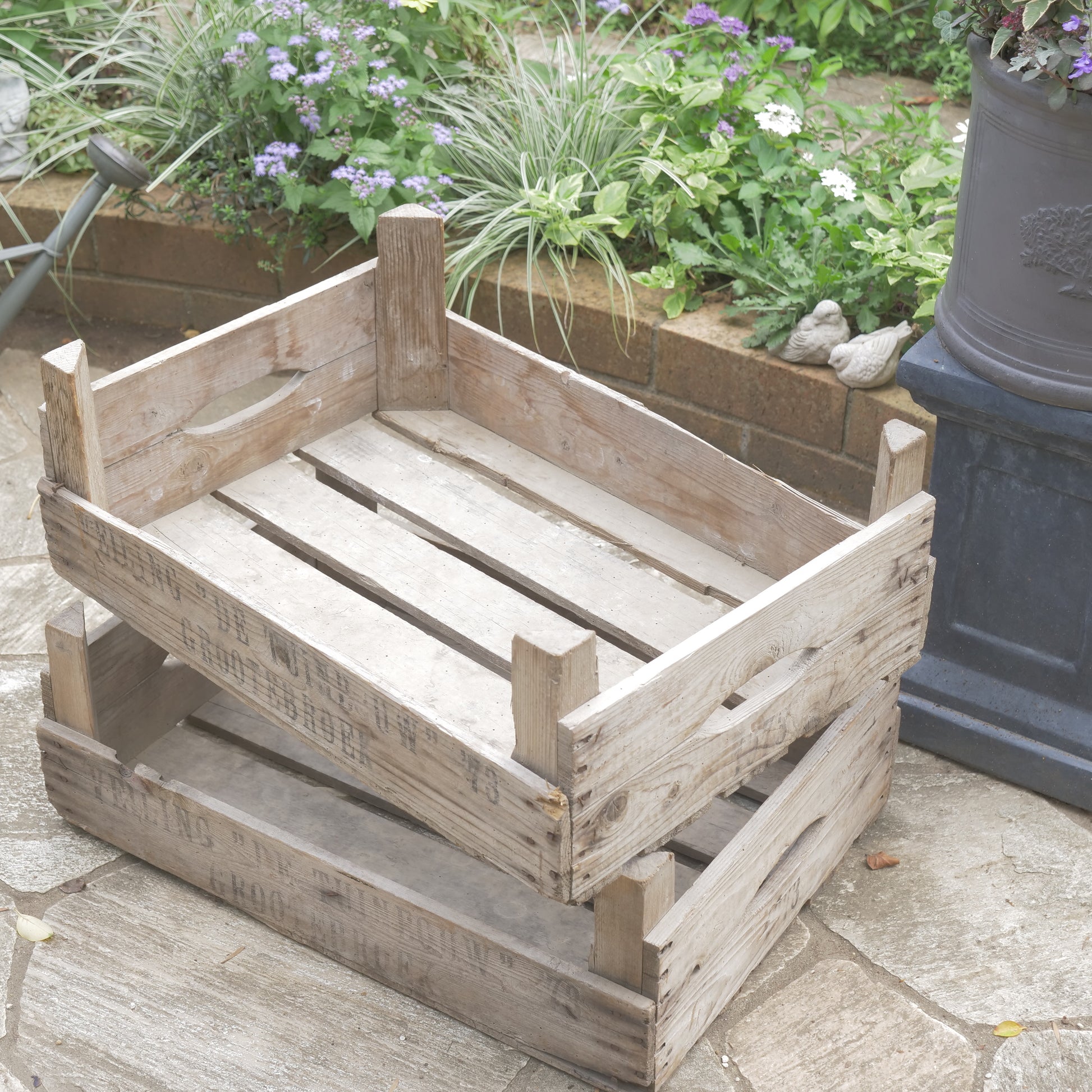 こちらは、【ANTIQUE&BROCANTE】のカリフラワーボックスです。実際に50~70年代のオランダでカリフラワーの収穫用に使われていたボックスになります。使用感のある、アンティーク商品です。新しく作った商品ではなく、昔のものなのでそれぞれに味があり、釘の錆や、汚れ、虫食いなどがあります。ガーデン用品を入れたり、苗を保管したり、野菜の収穫に使うなど、アンティーク商品としてお庭で楽しんでください。やや大きめのサイズです。