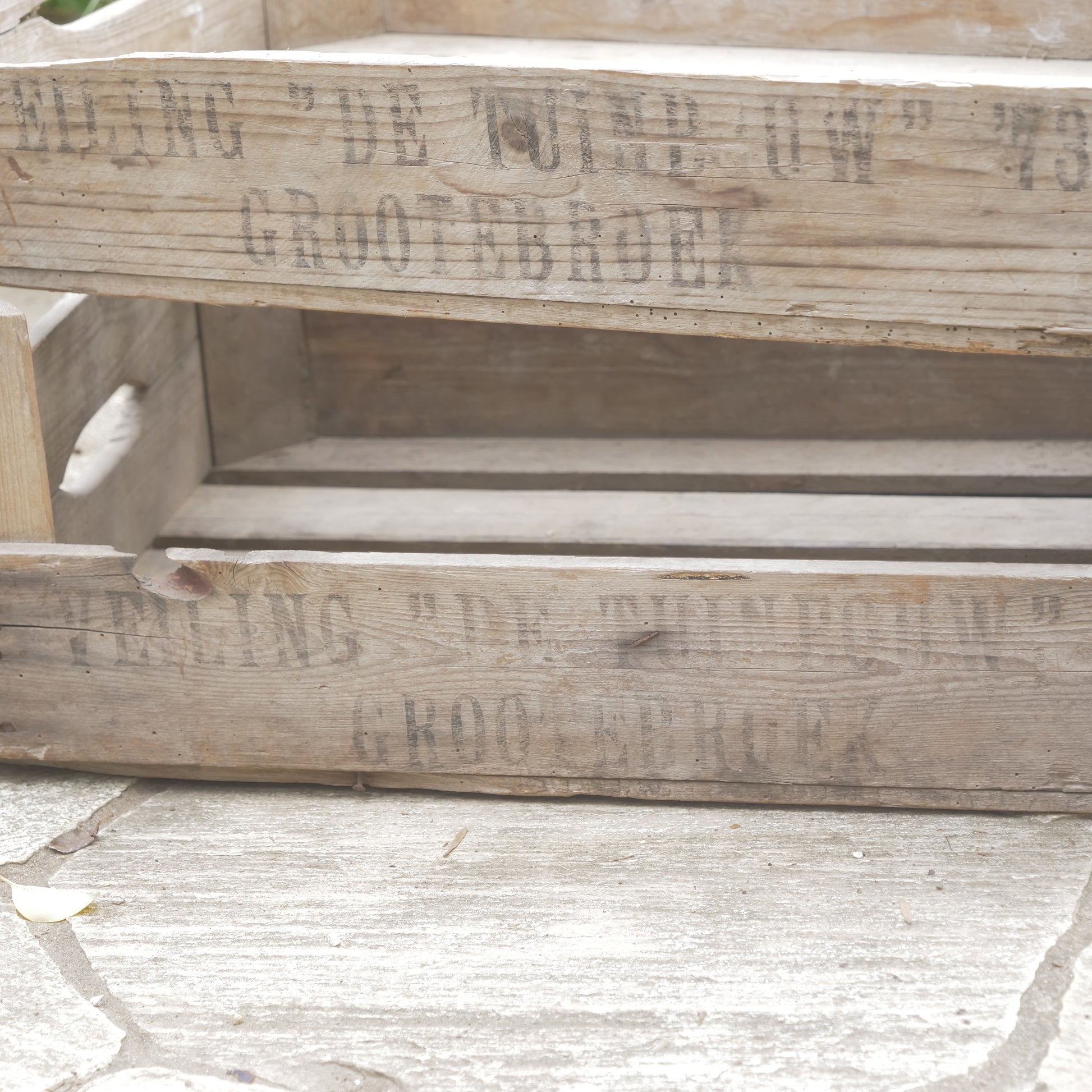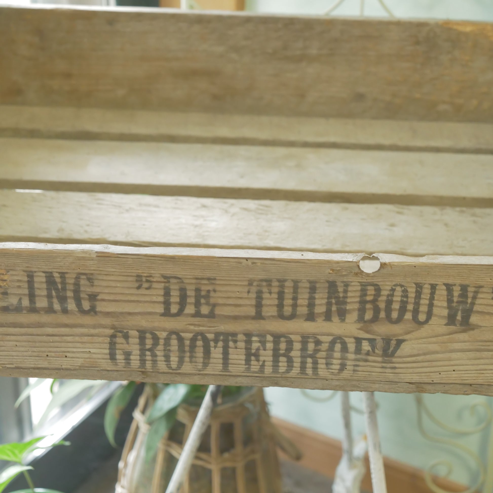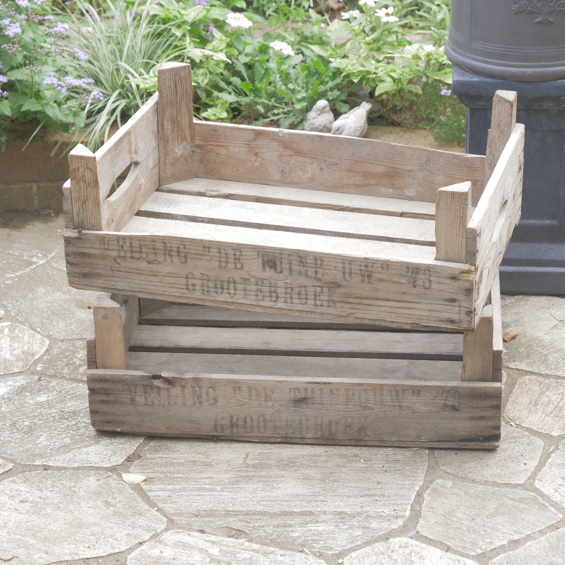 こちらは、【ANTIQUE&BROCANTE】のカリフラワーボックスです。実際に50~70年代のオランダでカリフラワーの収穫用に使われていたボックスになります。使用感のある、アンティーク商品です。新しく作った商品ではなく、昔のものなのでそれぞれに味があり、釘の錆や、汚れ、虫食いなどがあります。ガーデン用品を入れたり、苗を保管したり、野菜の収穫に使うなど、アンティーク商品としてお庭で楽しんでください。やや大きめのサイズです。